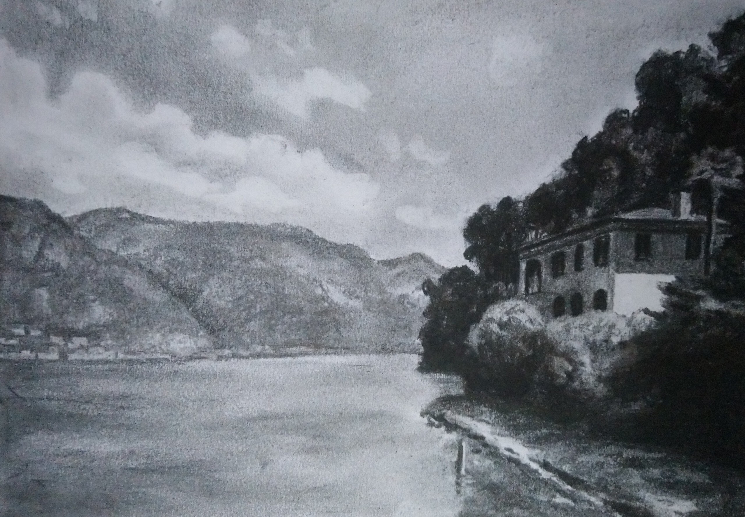 Tekening Houtskool Houtskooltekening Bergen Bomen Huis Water
