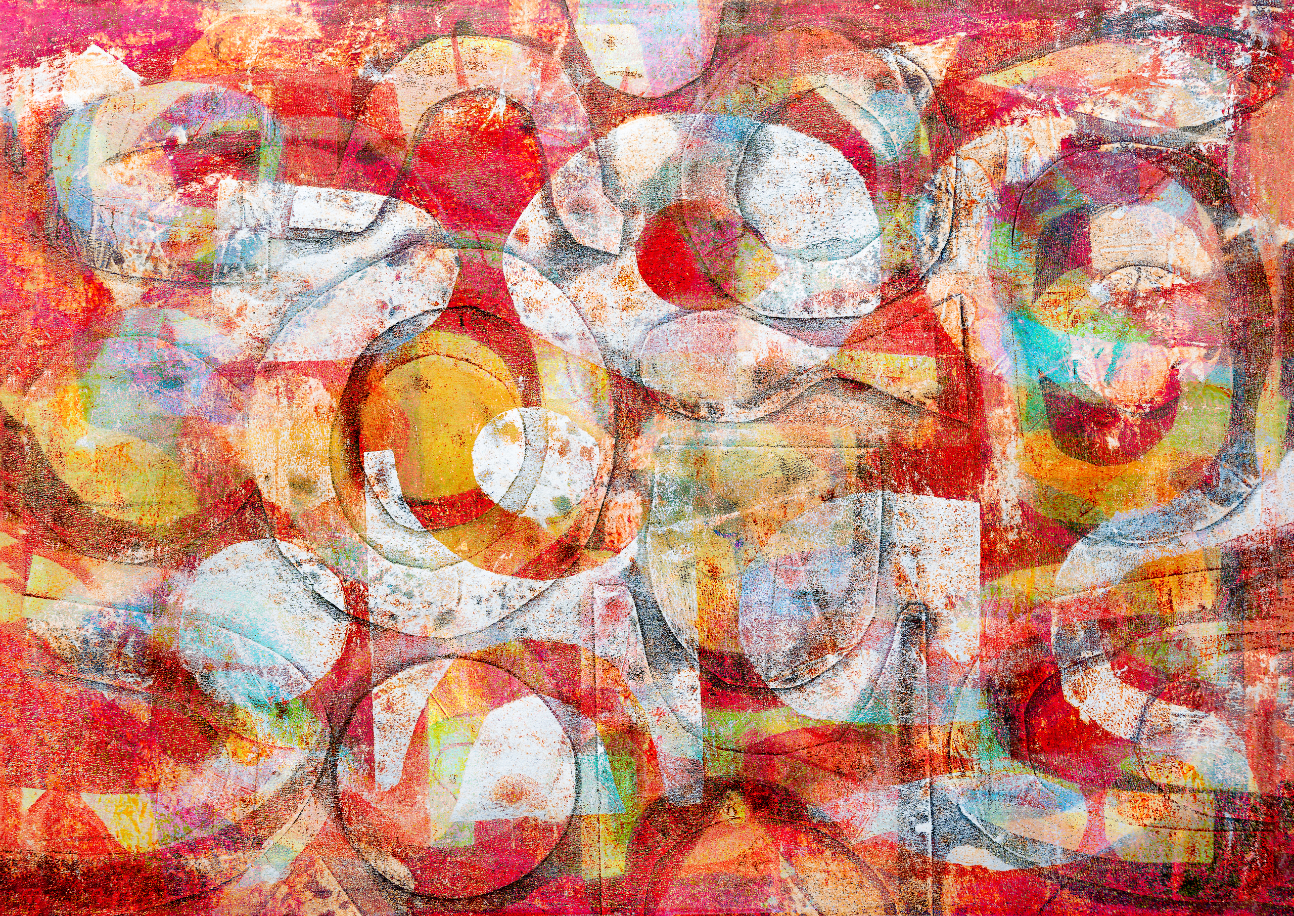 eze monotype of monoprint is gemaakt met een gelliplate en acrylverf. Een uniek handgemaakt en eenmalig werk, er kan maar 1 afdruk worden gemaakt van je ontwerp. Door de grafische druktechniek en het gebruikte papier ontstaan er allerlei structuren en effecten. Dat maakt het interessant om naar te kijken. Hier zijn vele lagen over elkaar geprint, met zelfgemaakte sjablonen ertussen. Dit heeft als gevolg dat er een bepaalde diepte in het werk lijkt te zitten. Elke laag laat een ander deel van het papier onbedrukt en geeft uiteindelijk een onvoorspelbaar resultaat door het ontstaan van restvormen. De warme rode kleur wordt afgewisseld met lichte delen die voor frisheid zorgen, wat koel lichtblauw en warm geel. Het zwart zorgt voor pit en een extra grafisch effect. Het is een warm en vrolijk werk als een brandend haardvuur, waar je ook naar de vlammen kunt blijven kijken om er steeds iets anders in te zien. Of als een zonsondergang spiegelend in het rimpelende water. Dit werk doet het ook goed als een beetje grunge behang. Kies zelf maat en materiaal en bestel het in mijn shop bij WerkaandeMuur https://www.werkaandemuur.nl/nl/shopwerk/Abstract-schilderij-in-rood/1098317/132