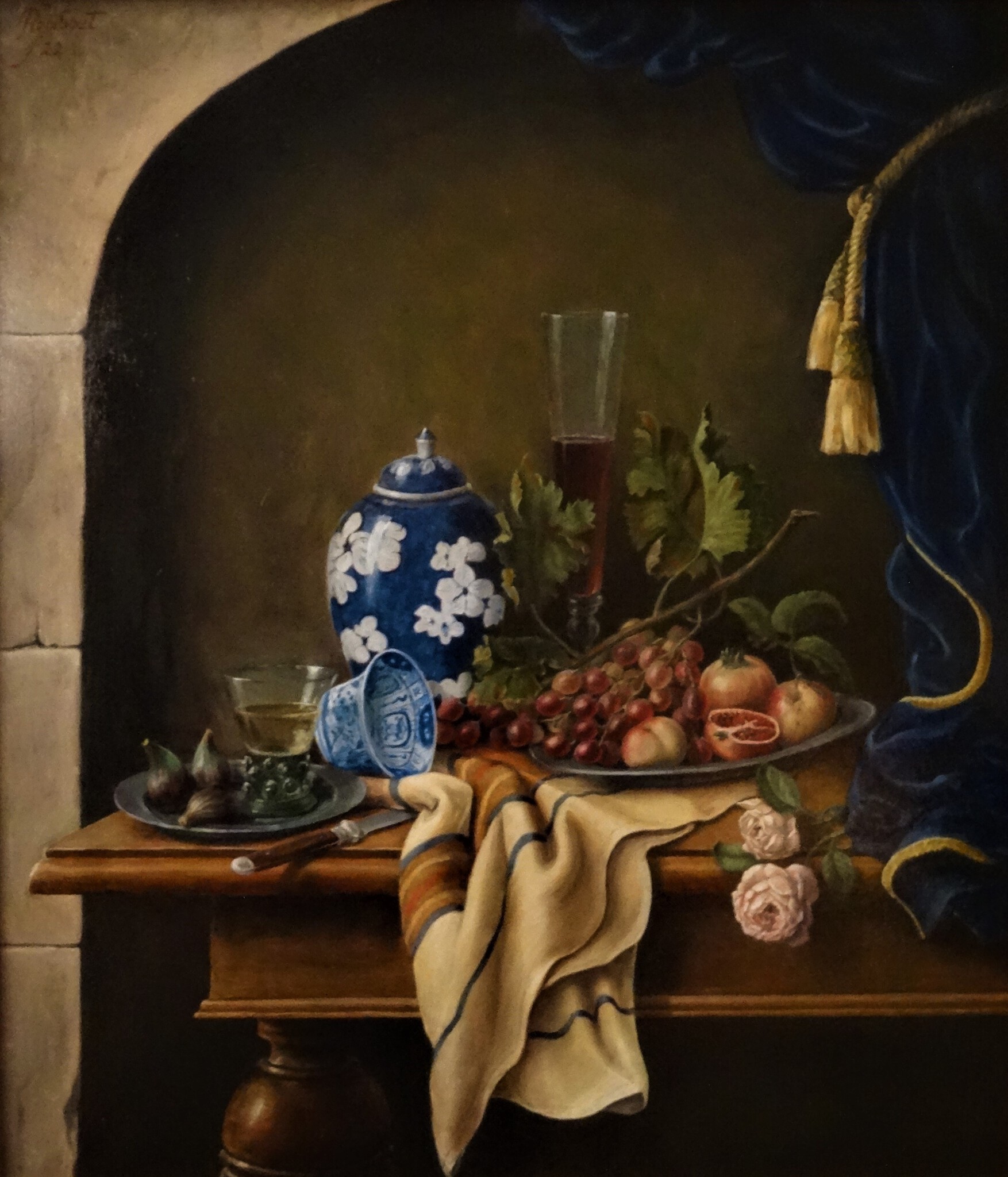Stilleven met chinees porselein en fruit.