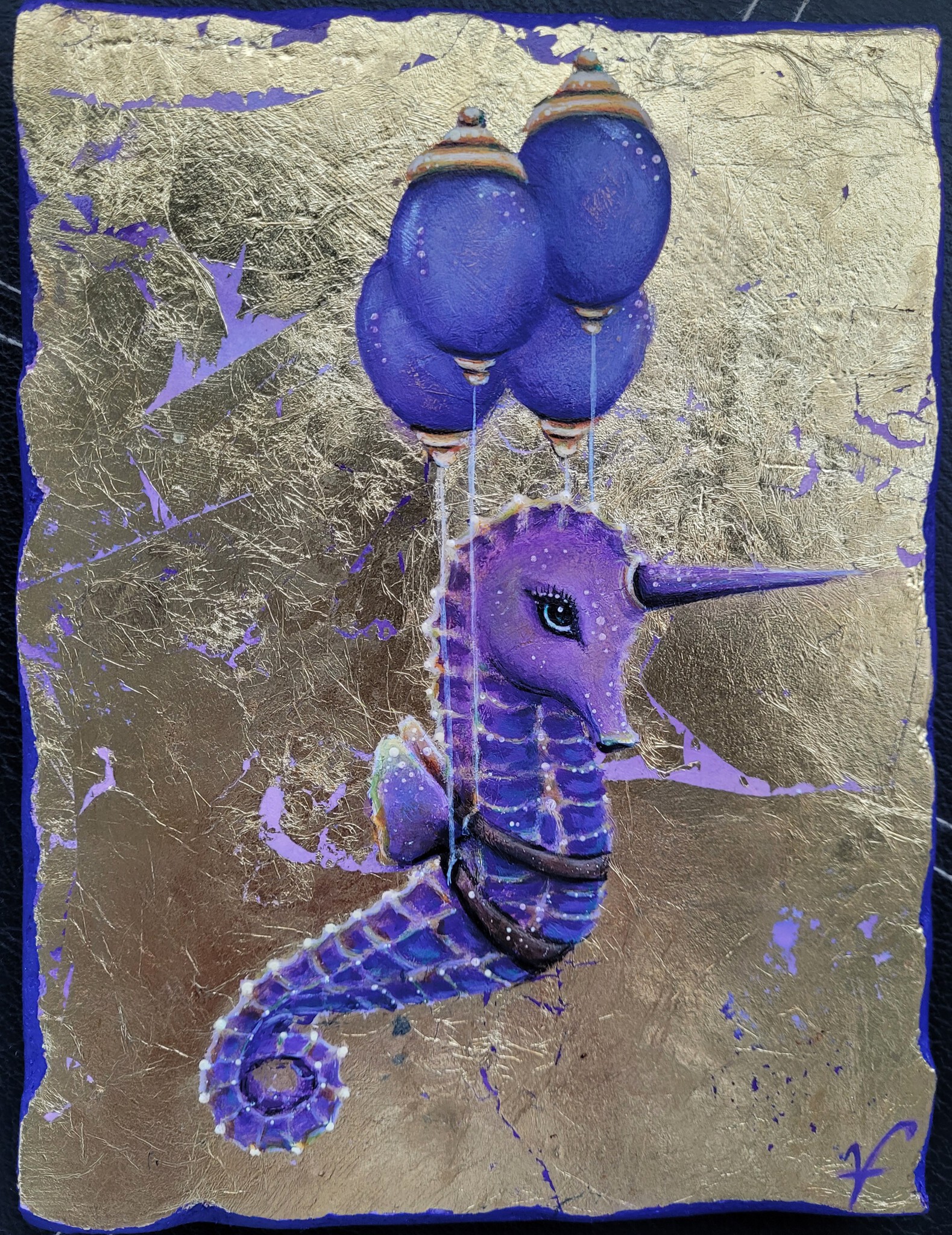 Little Sweetart met een 'lichtgids'. Een éénhoorn-zeepaardje dat 4 lampionnen vervoert. afgebeeld in paars tegen een achtergrond van bladgoud. Afm. 20 x 15 cm. Gratis verzending !