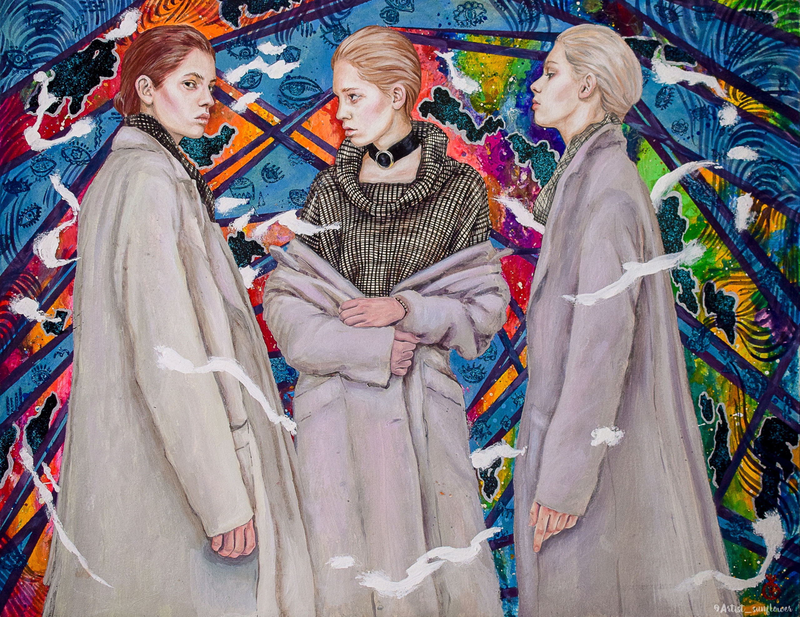 De foto - «Selectie» uit een serie werken «Vrienden mee worden afgrond". We hebben angsten, twijfels, onzekerheid, goed en kwaad diep van binnen. De hoofdpersoon van de foto is een meisje dat voor een keuze staat en een beslissing neemt. Welk deel van mij moet ik accepteren? De koude, arrogante, ongevoelige en een kaasschaaf of een goede, vriendelijke en beslissende? Het meisje draaide haar hoofd naar het goede en stopte haar blik. De keuze is gemaakt. Slechts één van de meisjes kijkt de kijker aan. Haar blik is vol vastberadenheid, kracht en onverschrokkenheid. Het is een portret van de sterke en goede persoonlijkheid van de heldin. Ondanks angsten, spanningen en onzekerheid koos ze haar sterke kant. Een wijde wereld met donkere en lichte kanten stelt ons in staat om alle kleuren om ons heen te zien en geeft ons de mogelijkheid om te kiezen en onszelf te accepteren zoals we zijn. Iedereen moet niet bang zijn om zijn eigen zwakheden toe te geven. Het is essentieel om niet alleen een goede of slechte keuze te maken, maar deze van binnen te accepteren. Het is het moment waarop je jezelf accepteert wanneer je harmonie bereikt, want goed en kwaad zijn relatief en kunnen niet zonder elkaar bestaan. Ze creëren allebei balans en vullen elkaar aan en zijn één. Mixed media schildertechniek (acryl, inkt, lak, glitters). Schilderij «Selectie» canvas gespannen op een frame 77x60 cm