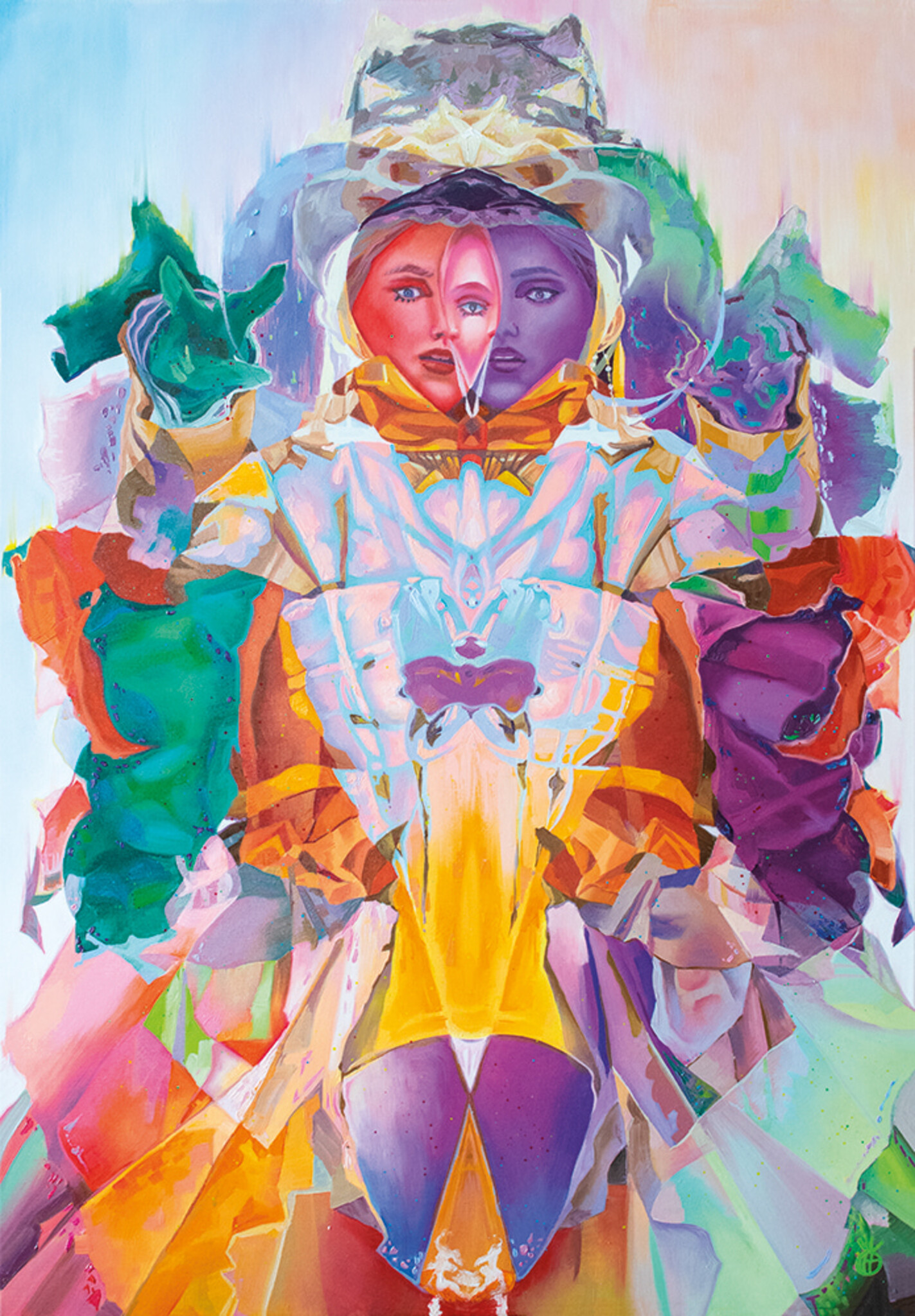 Elke persoon heeft twee kanten en het is onmogelijk om ze te scheiden. Het karakter van de foto toont de kijker beide helften, aangezien in het echte leven niet iedereen ze kan opmerken. Men moet dieper kijken om te zien. Hier zijn beide kanten, donker en licht, twee tegengestelden met elkaar vermengd. Het meisje lijkt een spiegeldimensie binnen te gaan en laat zowel de kijker als zichzelf zien hoe veelzijdig, onvoorspelbaar en mysterieus mooi haar duistere kant is. Er is niets slecht, zwart, koud of negatief in dit deel van de ziel. Het is een onafscheidelijke eenheid en harmonie. Tegenstellingen en verschillen leven in iedereen, maar dit is precies wat een persoon speciaal, interessant, veelzijdig en aantrekkelijk maakt voor anderen. De foto toont het moment van acceptatie en openstelling voor de wereld. Het gezicht van het personage is uit elkaar gevallen, waardoor de tegenstellingen in het meisje zichtbaar worden. Maar het lichaam demonstreert het gouden midden - een prachtige caleidoscoop van randen die elkaar reflecteren en aanvullen. Kijk eens naar jezelf. Kent u uw kanten? Accepteer ze van harte. Al je sterke en zwakke punten. Alleen hun harmonieuze verwevenheid zal je leven ongelooflijke bonussen geven en je echt gelukkig en vrij maken. Gemengde media (acryl, olie) Gespannen canvas 116 x 80 cm