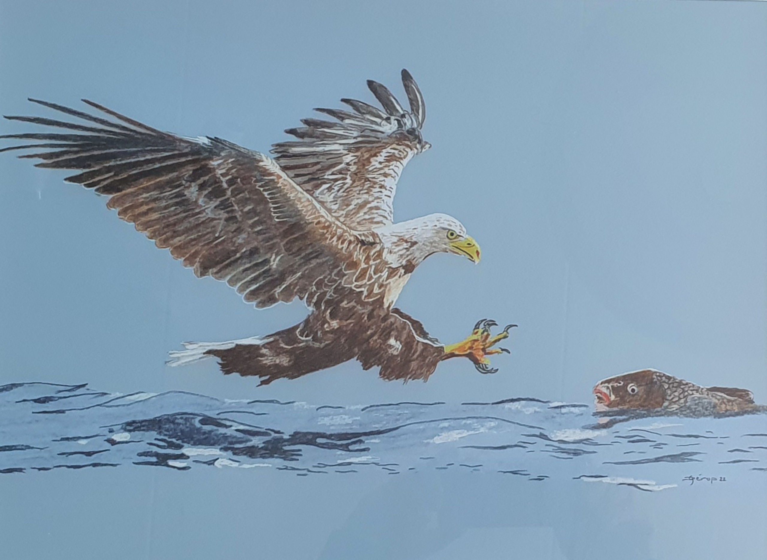 Zee arend, getekend op blauw passe partou karton