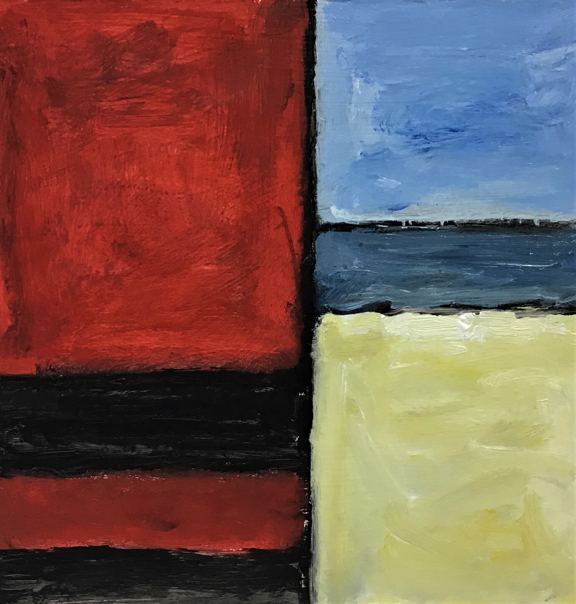 Texelse fragmenten waarbij de eenvoud het verhaal vertelt. 52 x 52 cm, incl. witte 10 cm brede lijst. Rode strandpaal teruggebracht tot minimalistische abstractie. VERKOCHT.