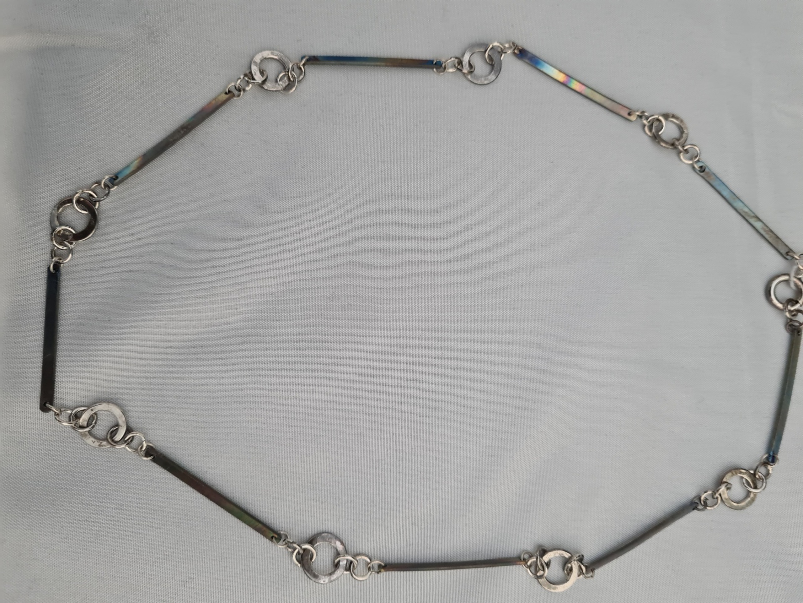Ik maak zilveren sieraden, soms met gouden accenten, Ook verwerk ik materiaal uit Z.Afrika (o.a. olifantenhaar,stekelvarkenpen,struisvogelei) en kunststof in mijn sieraden ik houd van strakke vormen