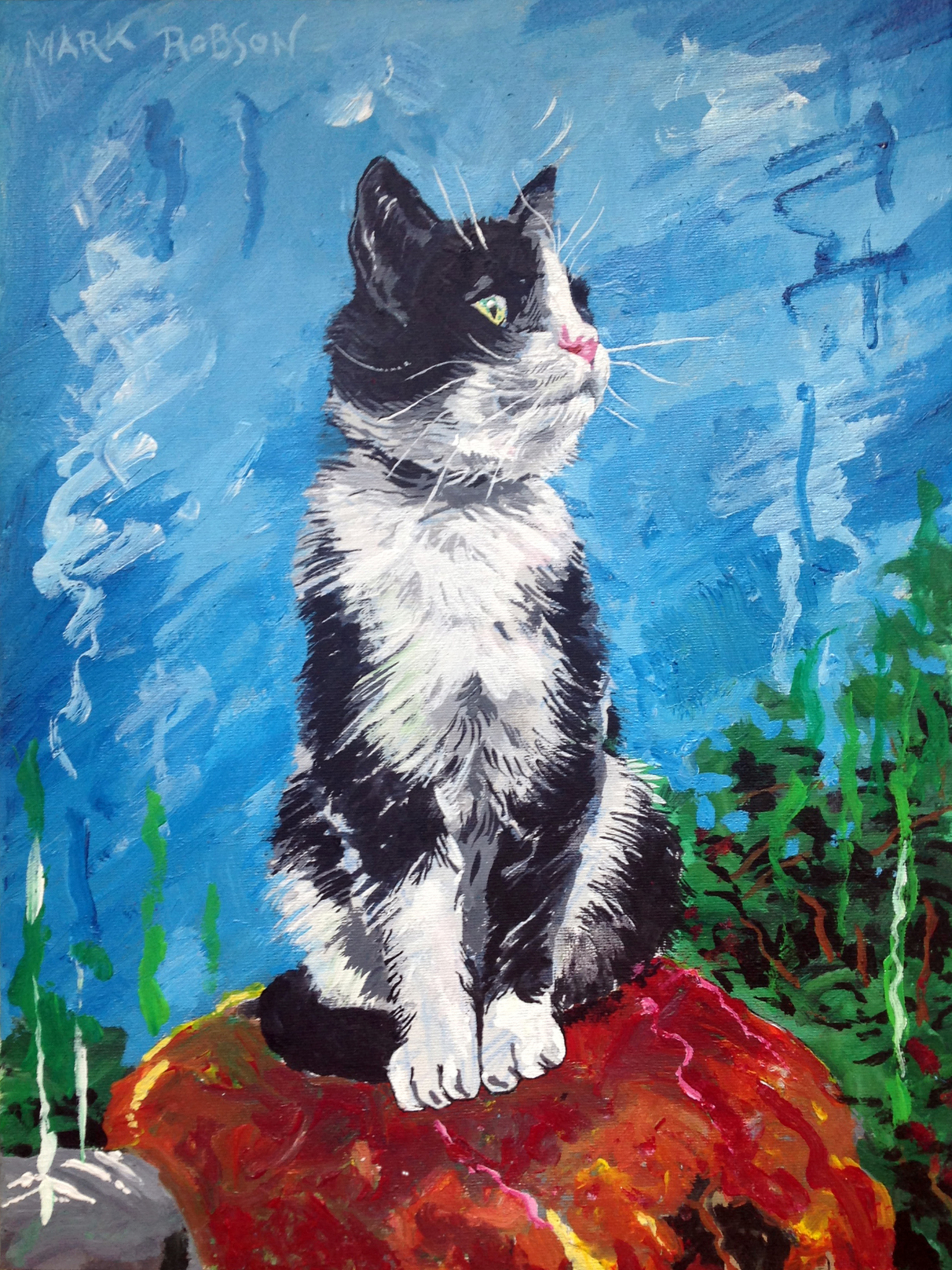 Portret van Mousty, mijn laatste beste kat-vriend (2002 - 2016). Hij had een heel zachte ziel, en was buitenshuis met momenten ook een enigszins aparte seriemoordenaar. En al dit pastte perfect bij mekaar. Aanvankelijk wou ik graag bij diens leven een portretje van hem schilderen, maar helaas vertrok hij veel te vroeg naar de andere zijde. Onlangs in december 2022, heb ik dan dit portretje gecreëerd.