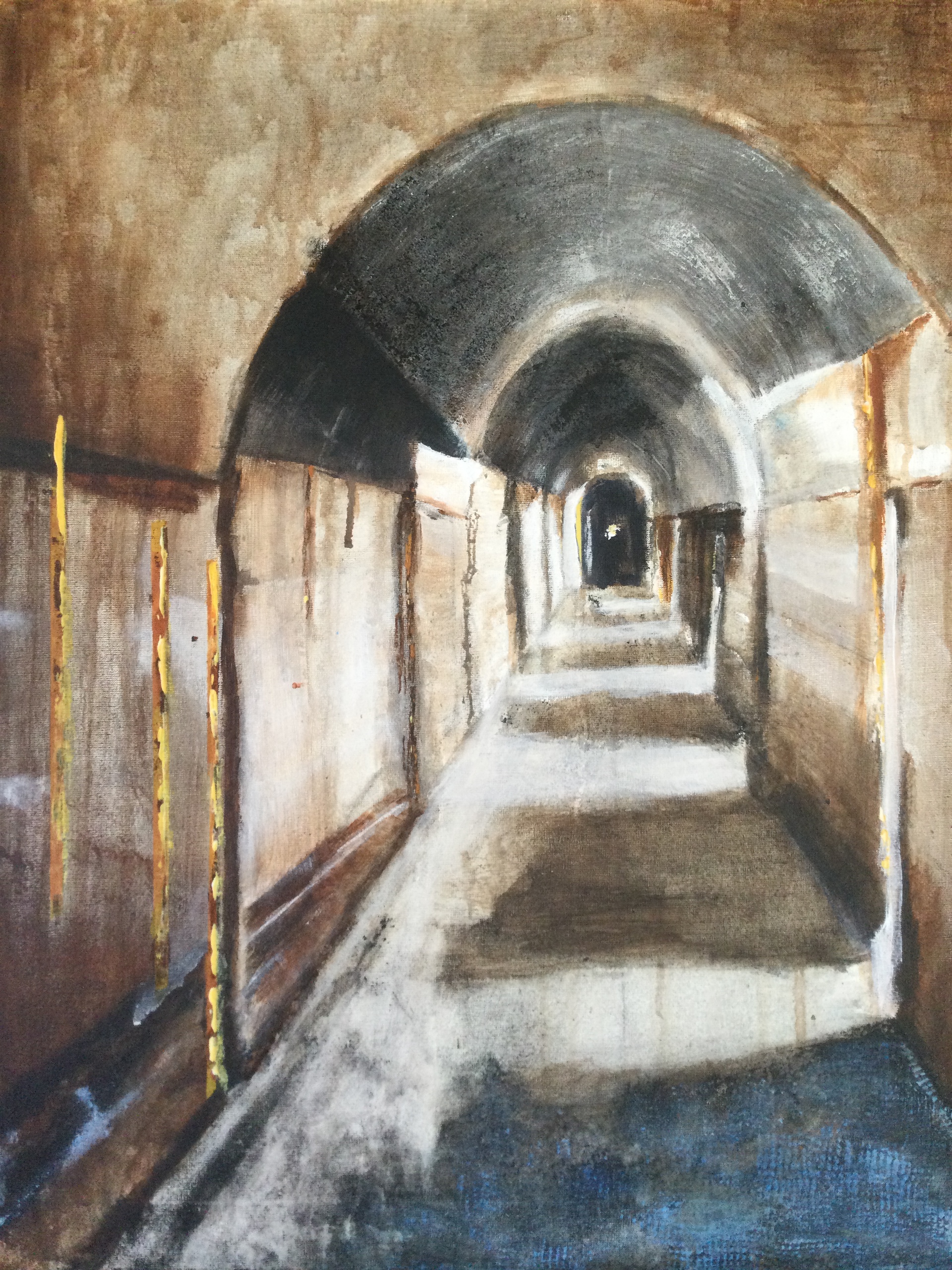 Acryl Licht Realistisch Donker Oude Verlaten Glorie Kloostergang
