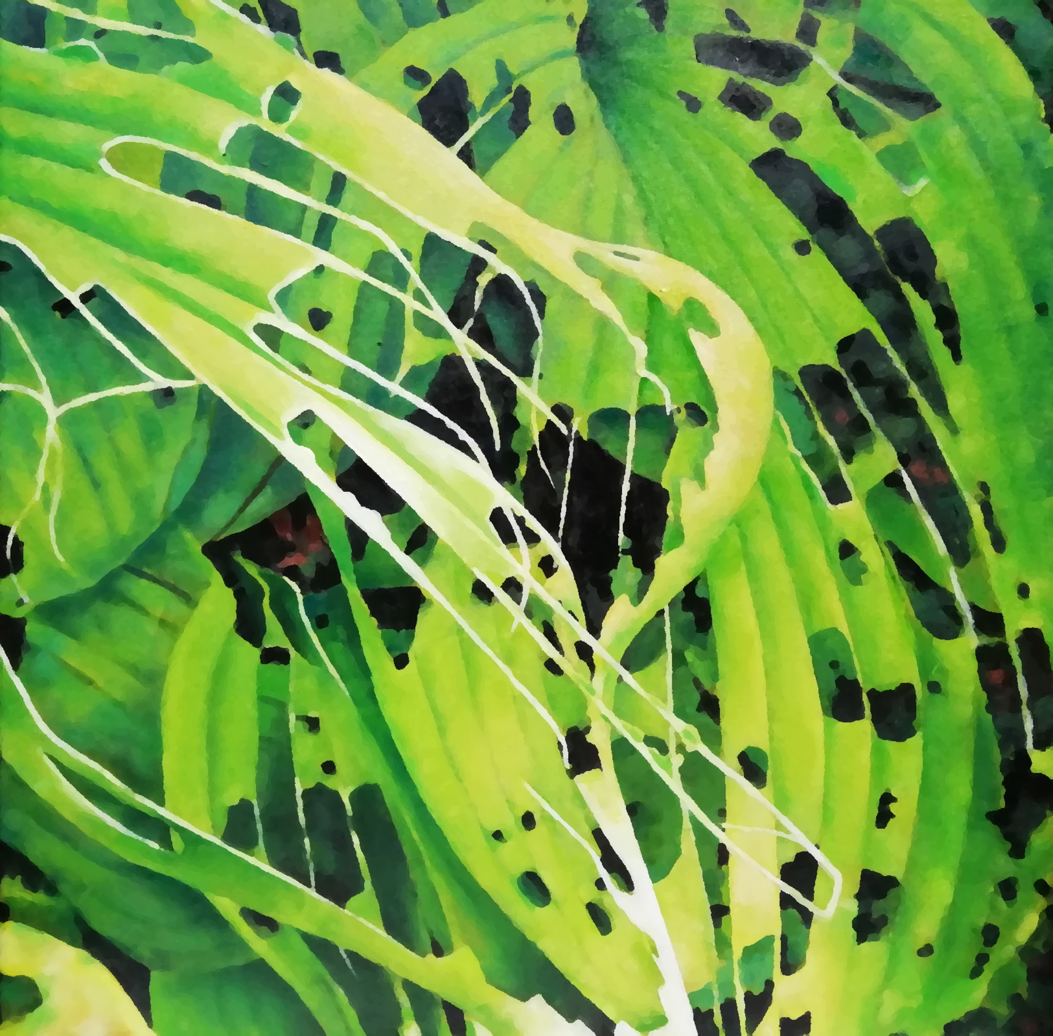 In het najaar sterft het blad van de hosta langzaam af en dat proces gaat gepaard met een fascinerend (en soms kleurrijk) verval. Dat levert verrassende 'doorkijkjes' op, resulterend in een gelaagd beeld.
