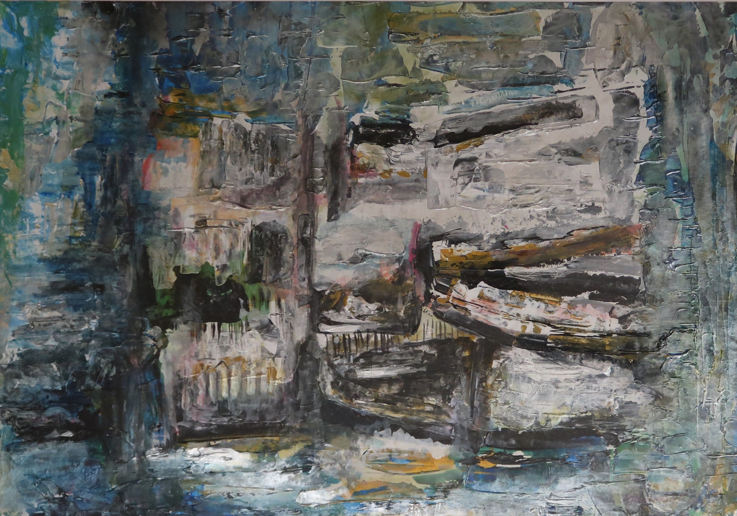 Tijdens de nieuwbouw van het wooncomplex Sarabande aan de Hogendijk werd op de bouwplaats deze scheepswerf blootgelegd. Deze historische oppgraving leverde veel historisch materiaal op. Op zuurvrij papier met paletmes en acrylverf. Lijst van gercycled hout en met witte passepartout.