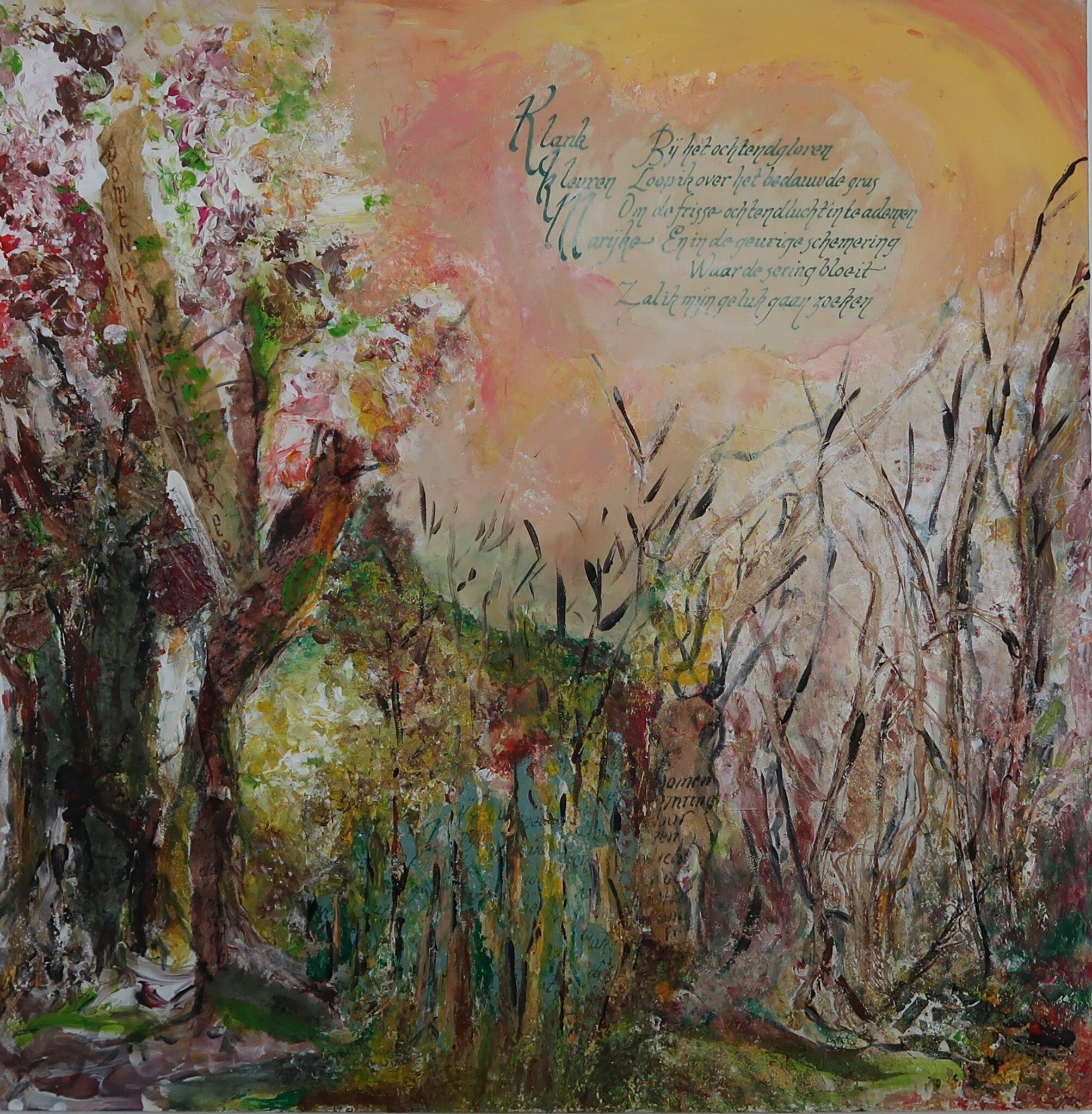 Tijdens een wandeling in de bossen bij Epe opgeraapt materiaal verwerkt en kalligrafie toegevoegd. Bij het ochtendglorten loop ik over het bedauwde gras om de frisse ochtendlucht in te ademen. En in de geurige schemering waar de sering bloeit, zal ik mijn geluk gaan zoeken.