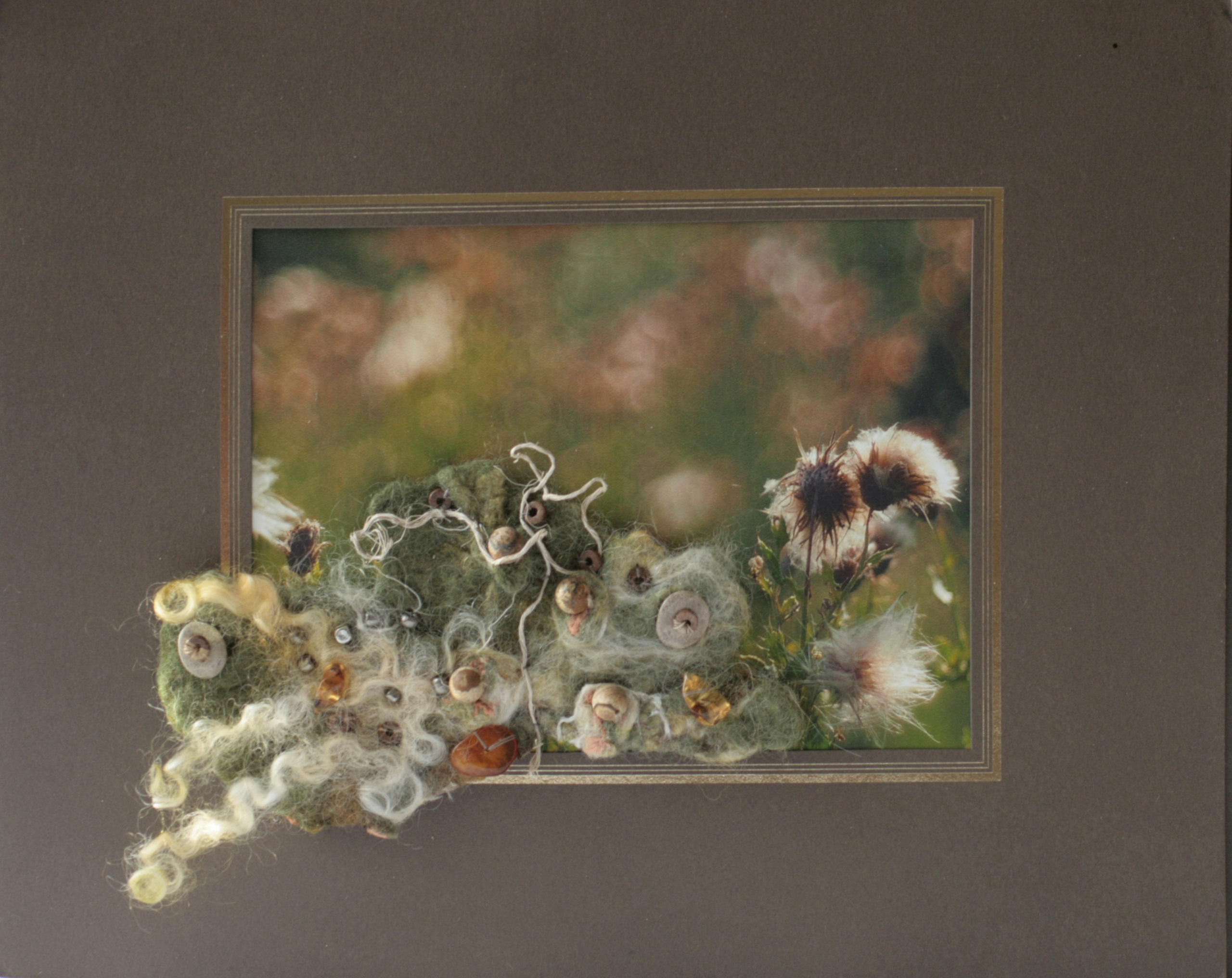 Mix media; op de basis van een eigen natuurfoto. Gekaderd in een bruin passe-partout met klein goudkleurig randje. Op de foto is vilt geborduurd en verder afgewerkt met kralen en borduursteken. Binnenzijde passe-partout 18 x 12,5 cm