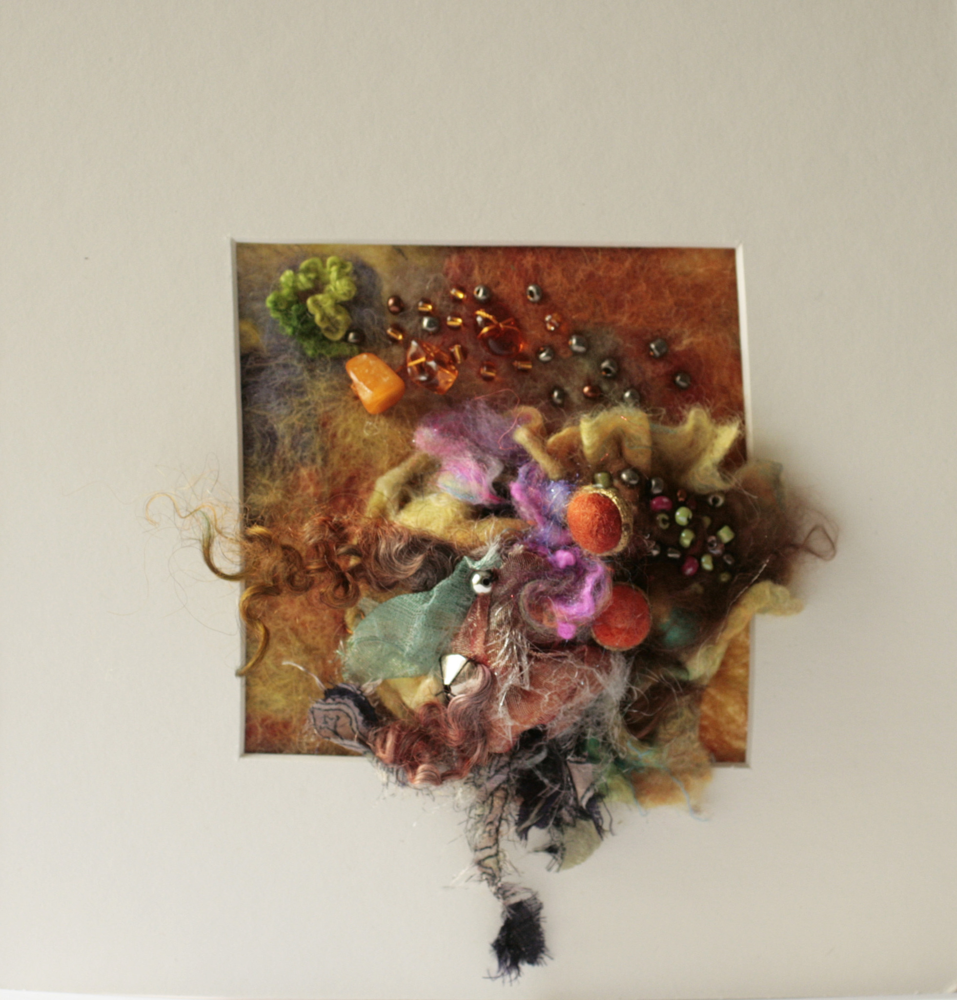 Een momentje op de bodem in het bos. Viltwerk in diverse natuurkleuren gekaderd in een licht vierkant passe-partout. Het viltwerk is gedecoreerd met veel verschillende stoffen, zijde, wollen krullen, vilten eikeltjes, barnsteen, kralen en borduursteken. Binnenmaat passe-partout is 11x11 cm