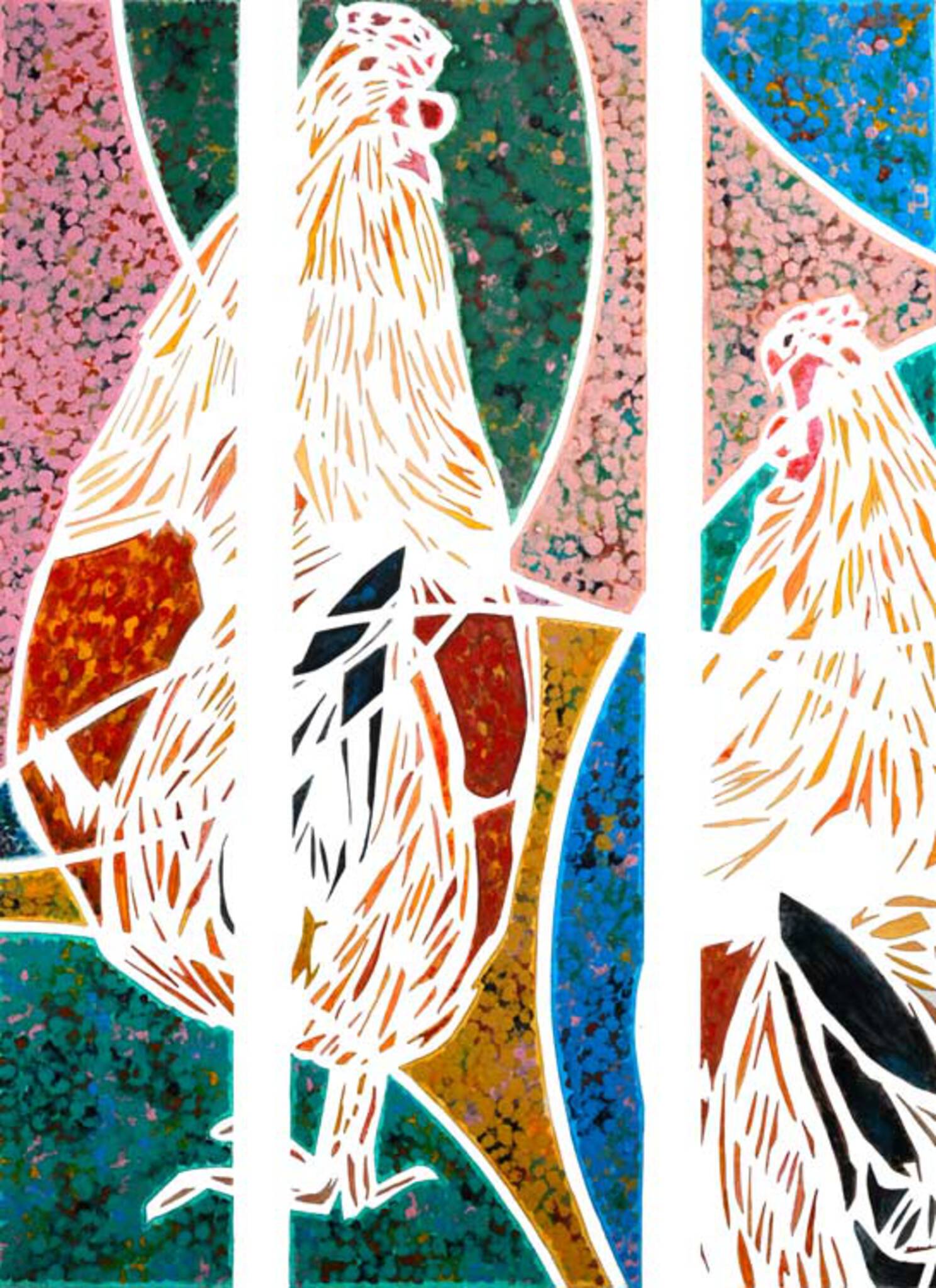 Parmantig loopt deze haan van ons vandaan. Het gedrag en uiterlijk van een haan verschilt wezenlijk van dat van de hen. Hanen hebben een sterke natuurlijke neiging hun territorium te verdedigen. Dat doen ze door te kraaien. De haan begint hiermee als hij volwassen wordt, afhankelijk van de soort met 14-20 weken. Bij vrijlopende kippen neemt de haan een waakzame rol op zich en waarschuwt voor roofvogels en andere gevaren. In tegenstelling tot hennen, die vluchten of zich stil houden bij gevaar, maakt hij zich groot en verdedigt de kippen ook tegen veel grotere vijanden. Als hij een lekker hapje vindt, zal hij in eerste instantie met speciale klok-geluiden de hennen roepen. Als die niet komen, zal hij het hapje alsnog zelf opeten en als de kippen met elkaar ruziën, springt hij ertussen, daardoor is een groep kippen met een haan doorgaans rustiger dan eentje zonder haan.
