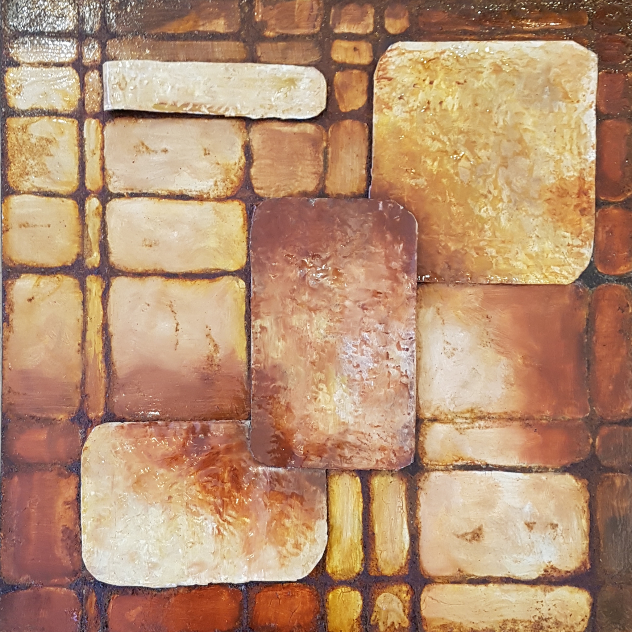 Een driedimensionaal kunstwerk, Blik op staal. Een strak patroon in roest, roestkleuren en oker. Het werk is nu drie jaar oud en ik kan daardoor zien dat het roesten heel, heel langzaam verder gaat. 60x60x5cm.