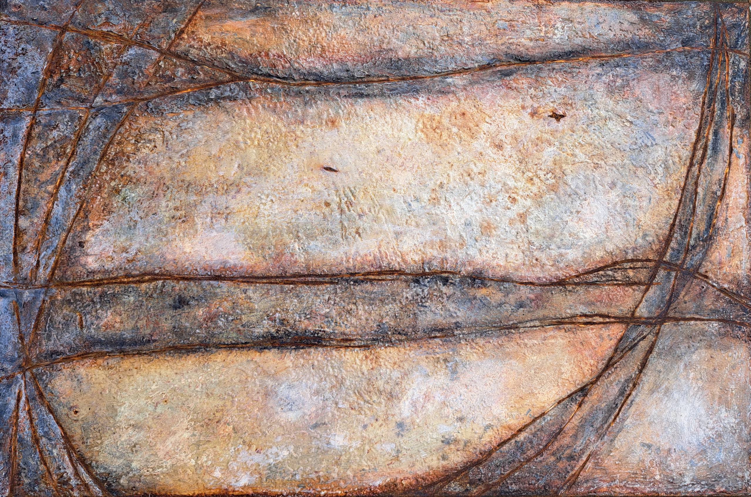 Olieverf op staal met roest. De tijd verstrijkt. Ouder worden valt eigenlijk best mee, milder en wijzer....maar ooit wint de roest (heel, heel langzaam). 60x90cm.
