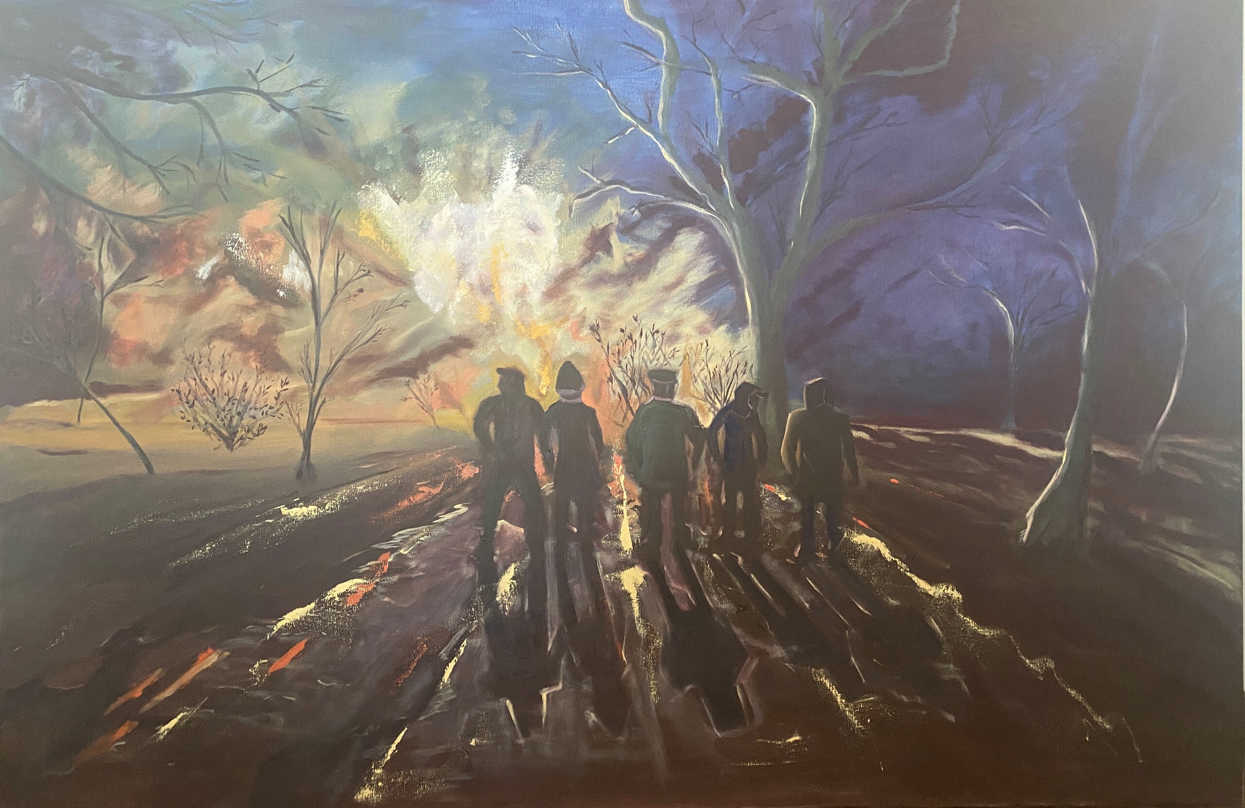 Olieverf Schilderij Groot Groep Man Mens Schaduw Weerkaatsing Nacht Oorlog Vernieling Destructie Vuur Blauw Bruin Oilpainting Big People Group Men Shadow Reflection War Fire Night
