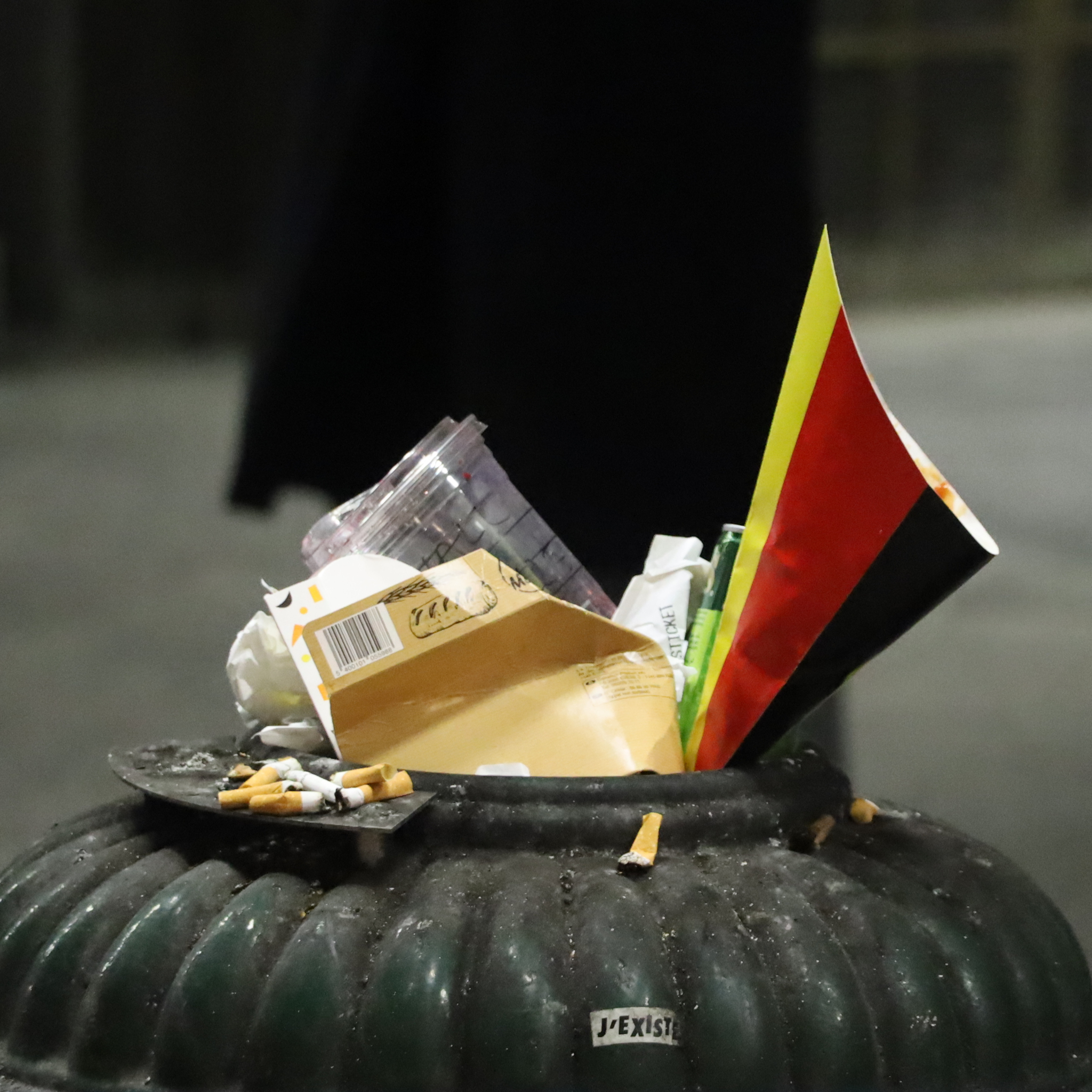 Stilleven van een overvolle afvalbak met symbolisch de friteszak in de nationale kleuren van Belgie.