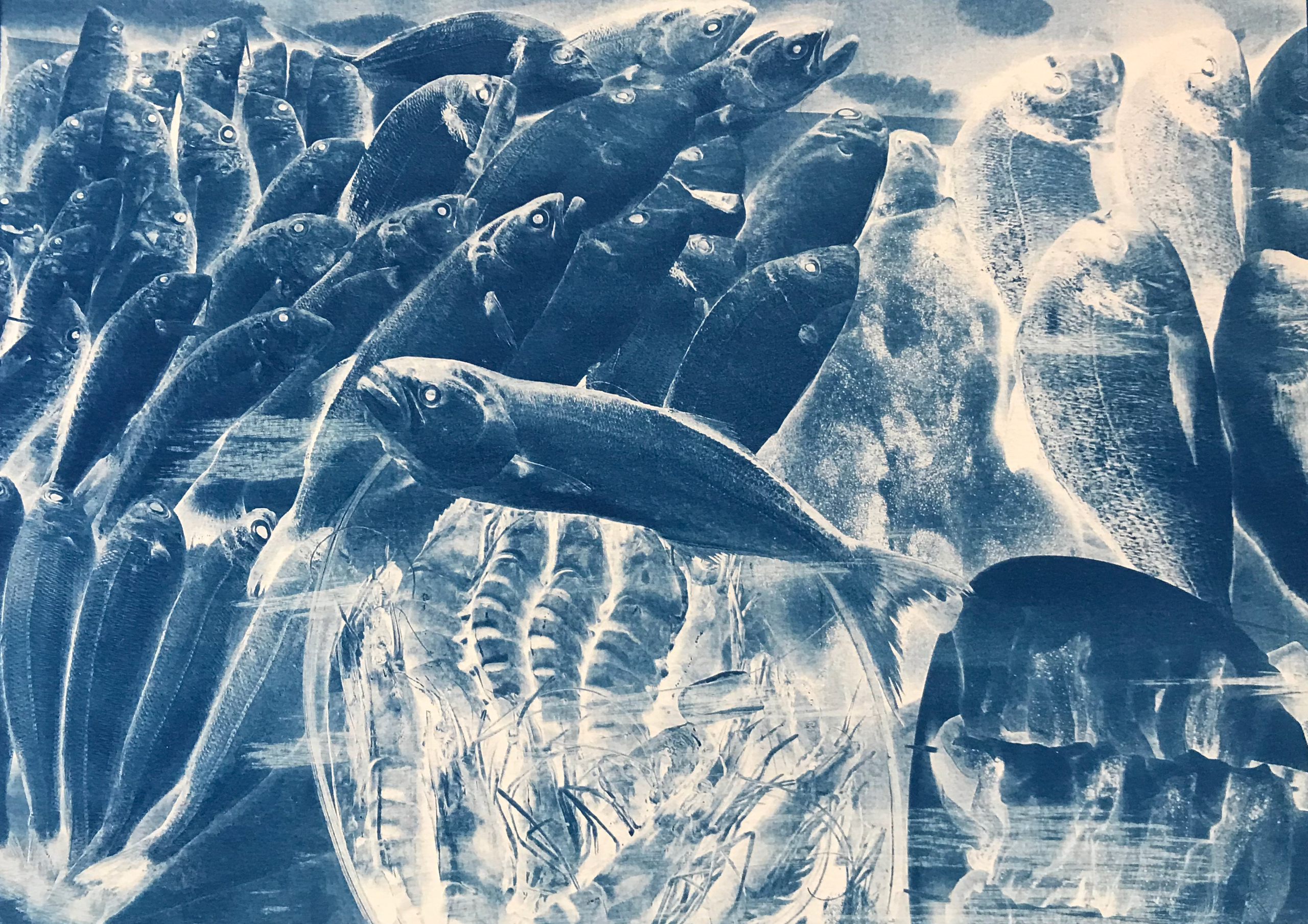 Oude foto van de vismarkt in Ayvalik heb ik nieuw leven gegeven m.b.v. cyanotypie