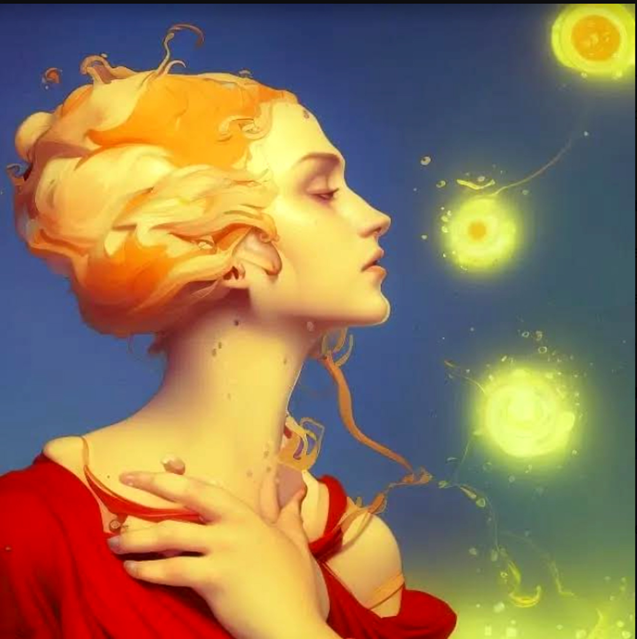 Digitale prent. Vrouw droomt over prettige belevenissen.