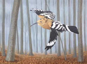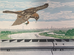 Acryl op linnen. Een paartje Kleine Torenvalken bij de ingang van hun nest in oude kerktoren