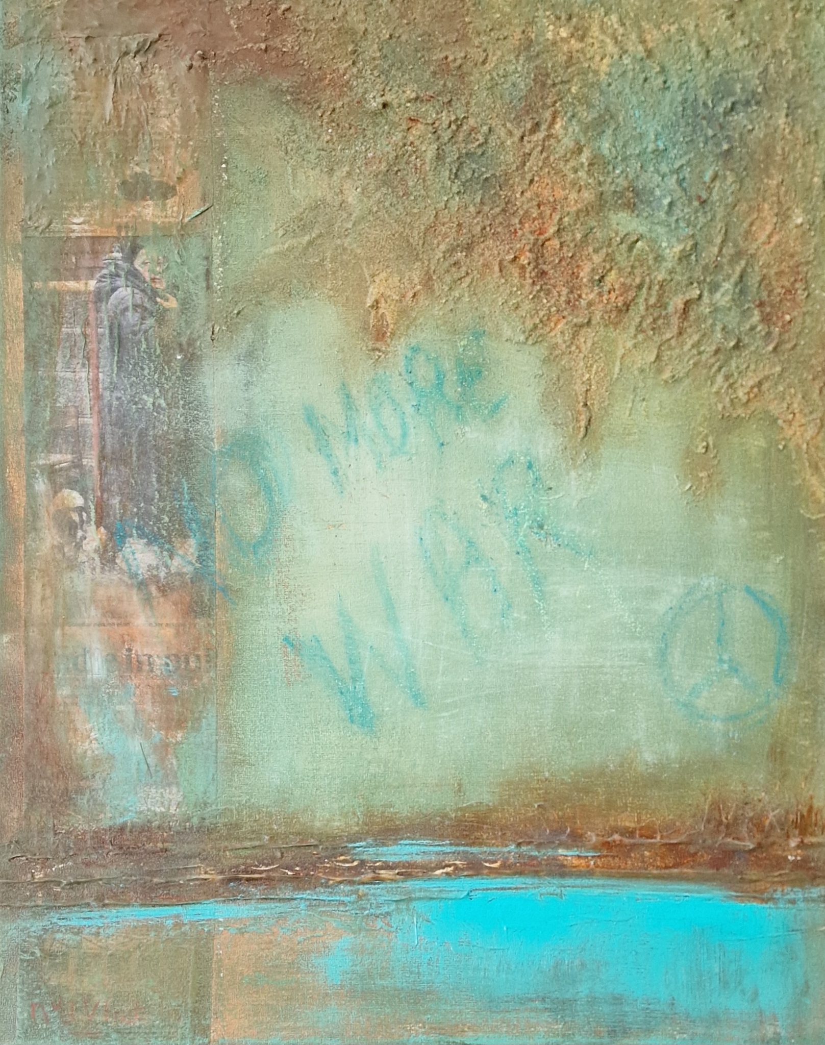 Gemengde techniek: collage, structuur, acrylverf oliepastelkrijt op canvas, gefixeerd