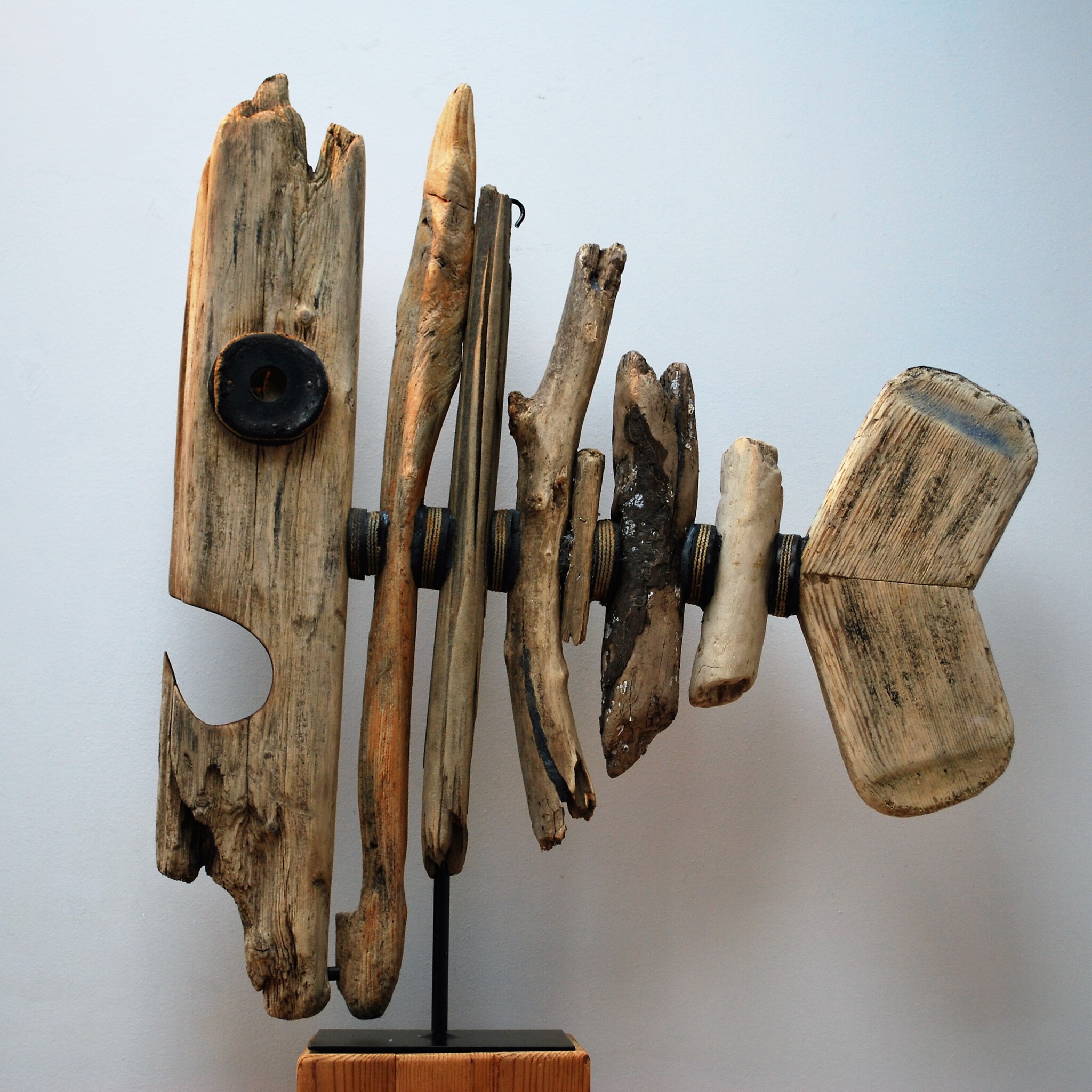 maakt al jaren houten beelden door natuurlijke objecten uit zee te koppelen. De beelden zijn ruw en puur.