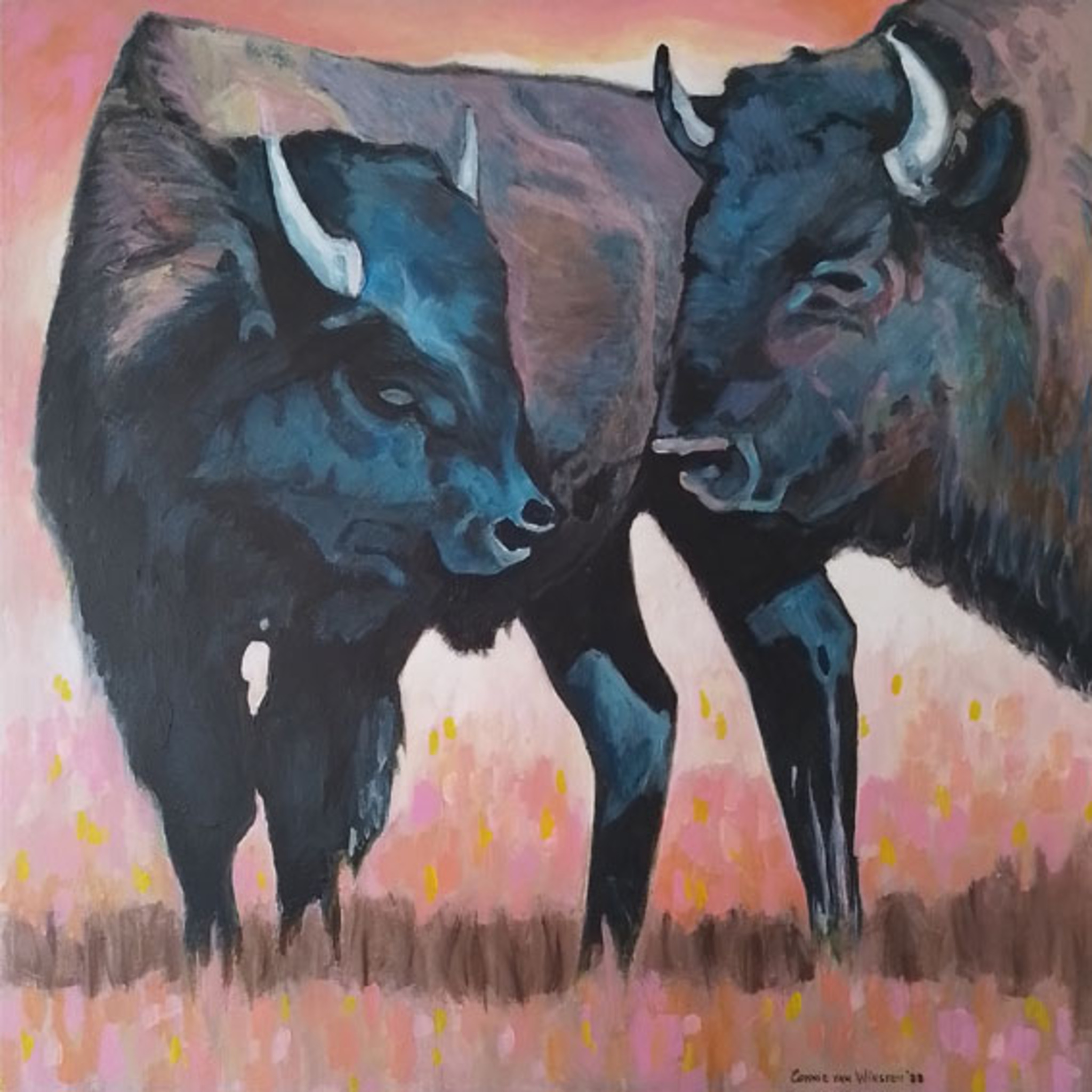 Connie maakt krachtige, kleurrijke schilderijen in acryl, zowel figuratief (mensen, dieren, landschappen en bloemen) als abstract