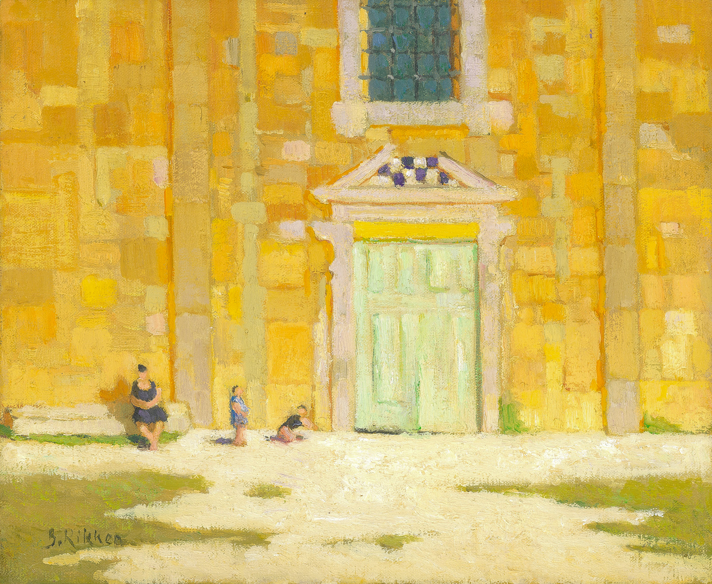 Het is na 16,00, de siesta is gedaan, De sterkste hitte is voorbij, de mensen uit Volterra komen weer uit hun huizen en ontmoeten elkaar vòòr de kerkdeur van het conventu ( klooster ) . Een grootmoeder past op haar kleinzoon. De gerestaureerde kerkmuur met al die verschillende gekleurde stenen, badend in een warm Italiaans zomerlicht . In het weekend zijn er oefeningen in kruisboogschieten, met middeleeuws formaat bogen.