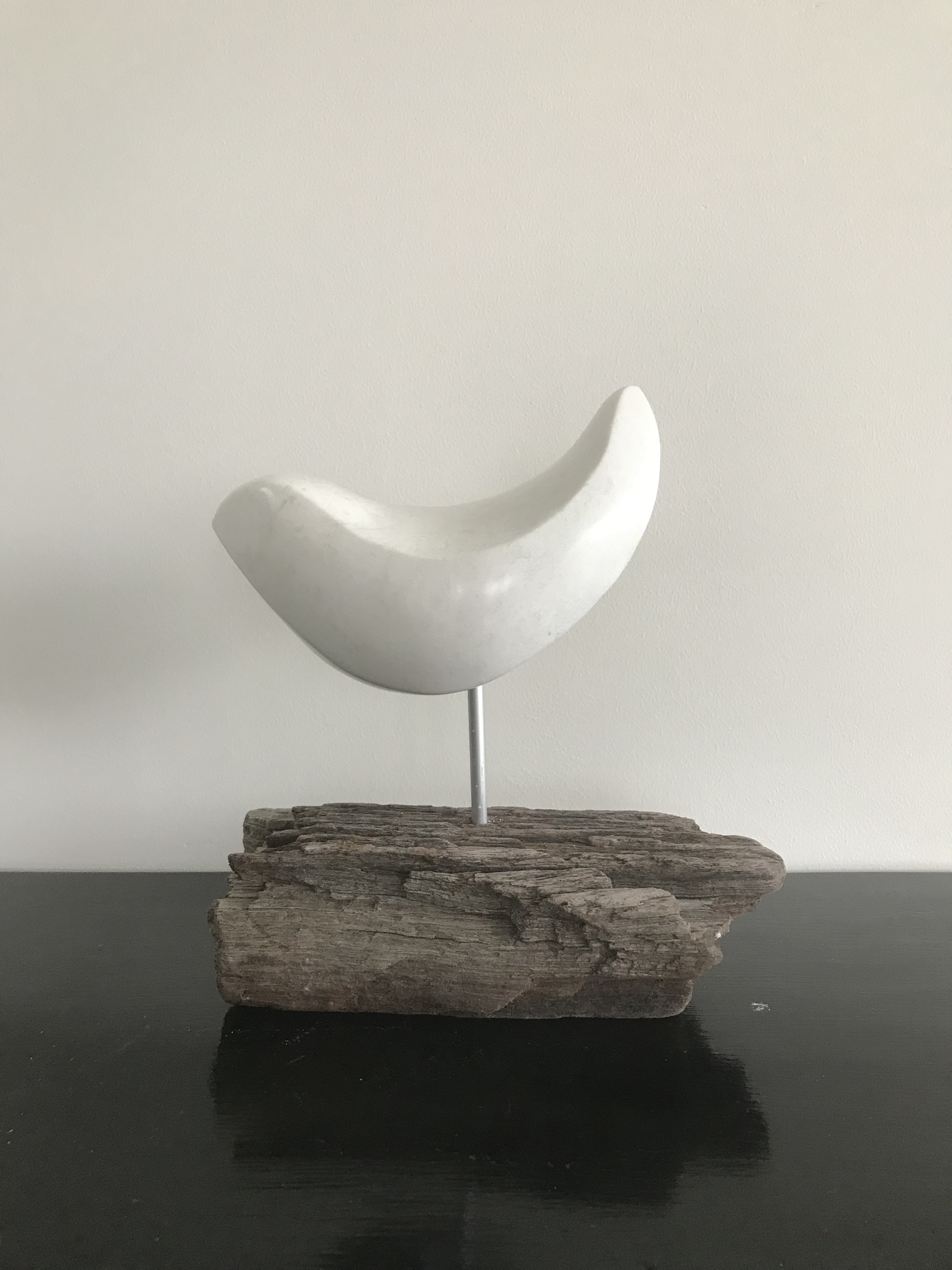 een strakke vogel van wit speksteen op een ruwe houten sokkel. verkocht.