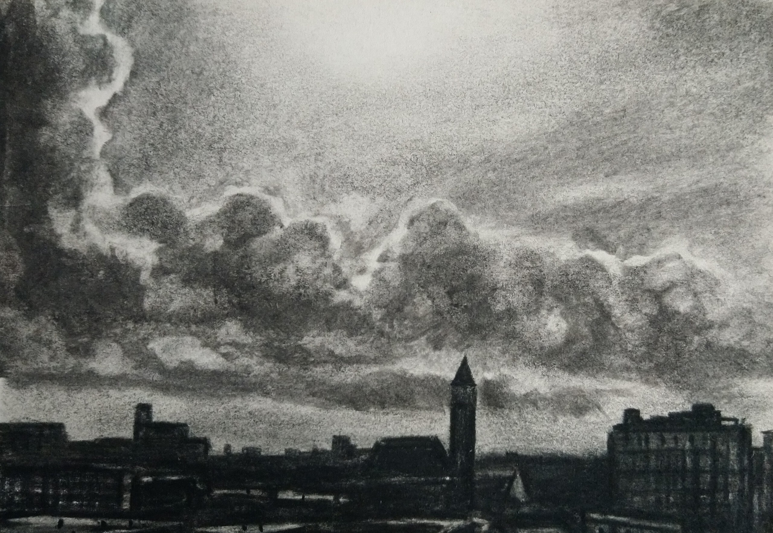 Stadsgezicht Skyline Wolken Zon Houtskooltekening Charcoal Charcoaldrwawing Huizen City Stad