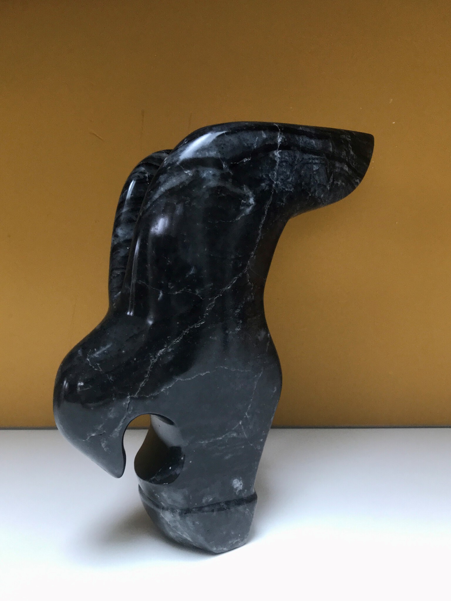 een roofvogel van zwarte steen. De vogel staat op een berkenstam in mijn voortuin.