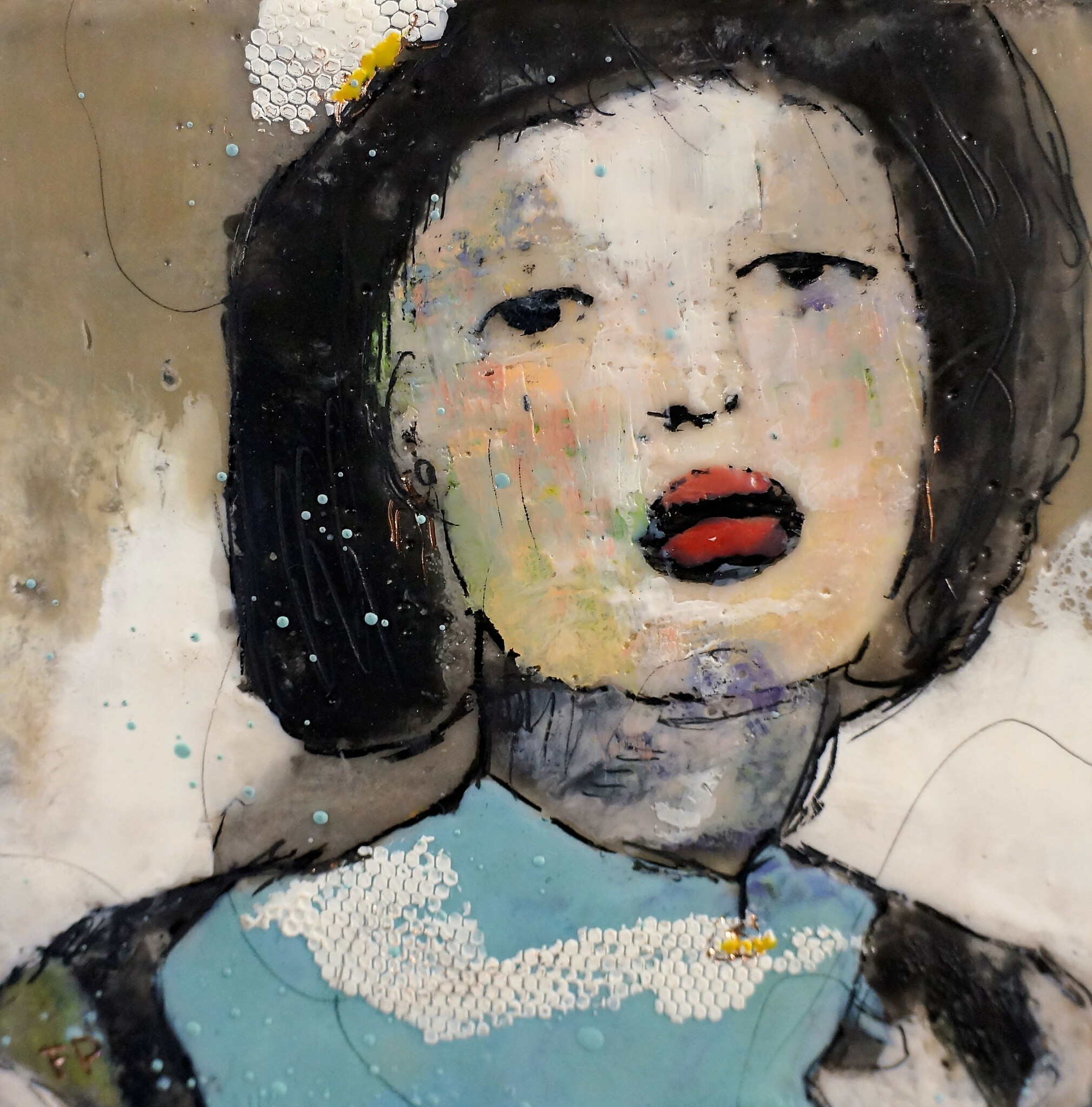 Encaustic Bijenwas Portret Aqua Blauw Wit Zwart Beige Rood Goud
