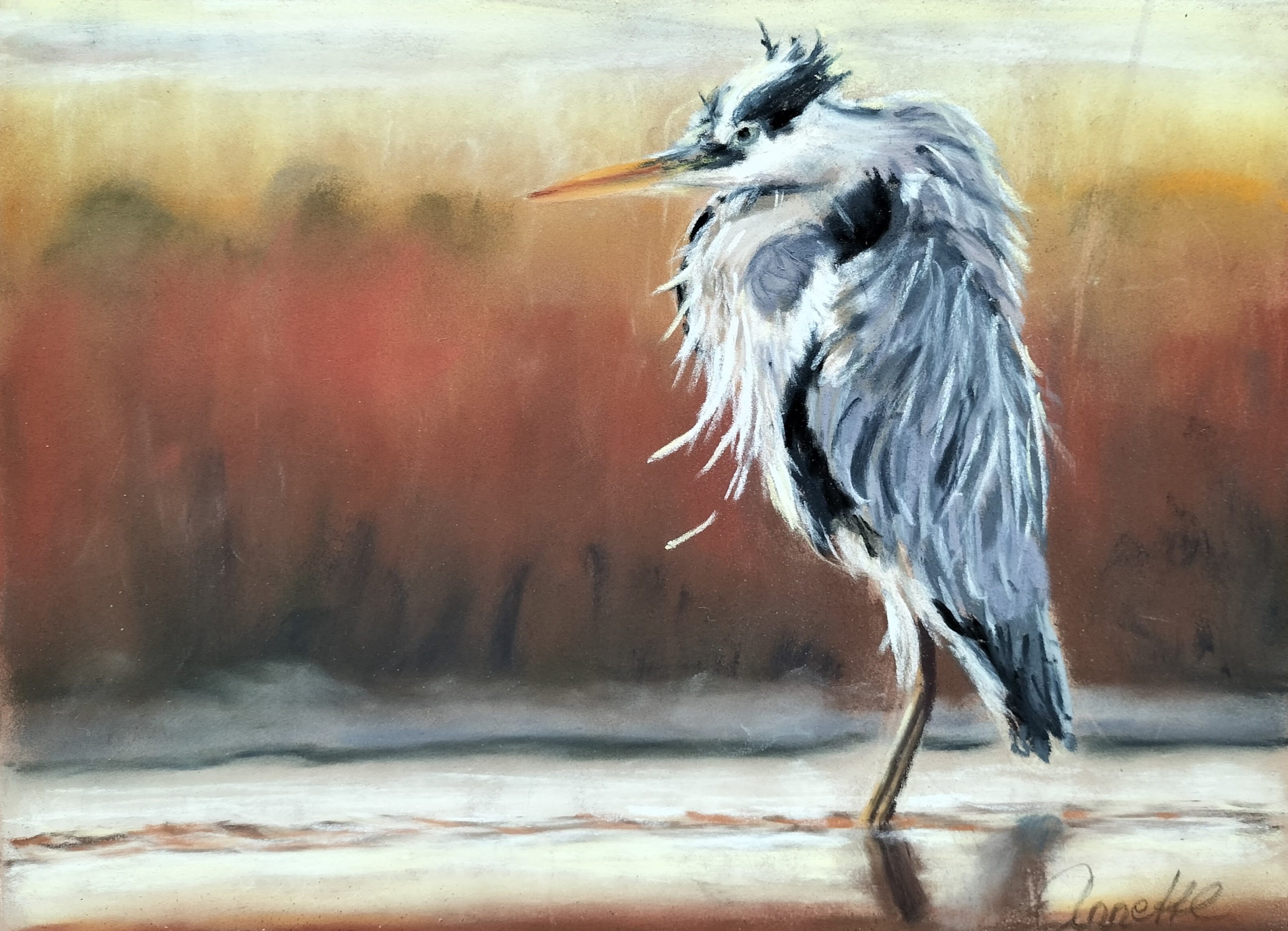 Wachtend op een goede vangst trotseert deze reiger de koude januariwind. Pastelkrijt op pastelmat.
