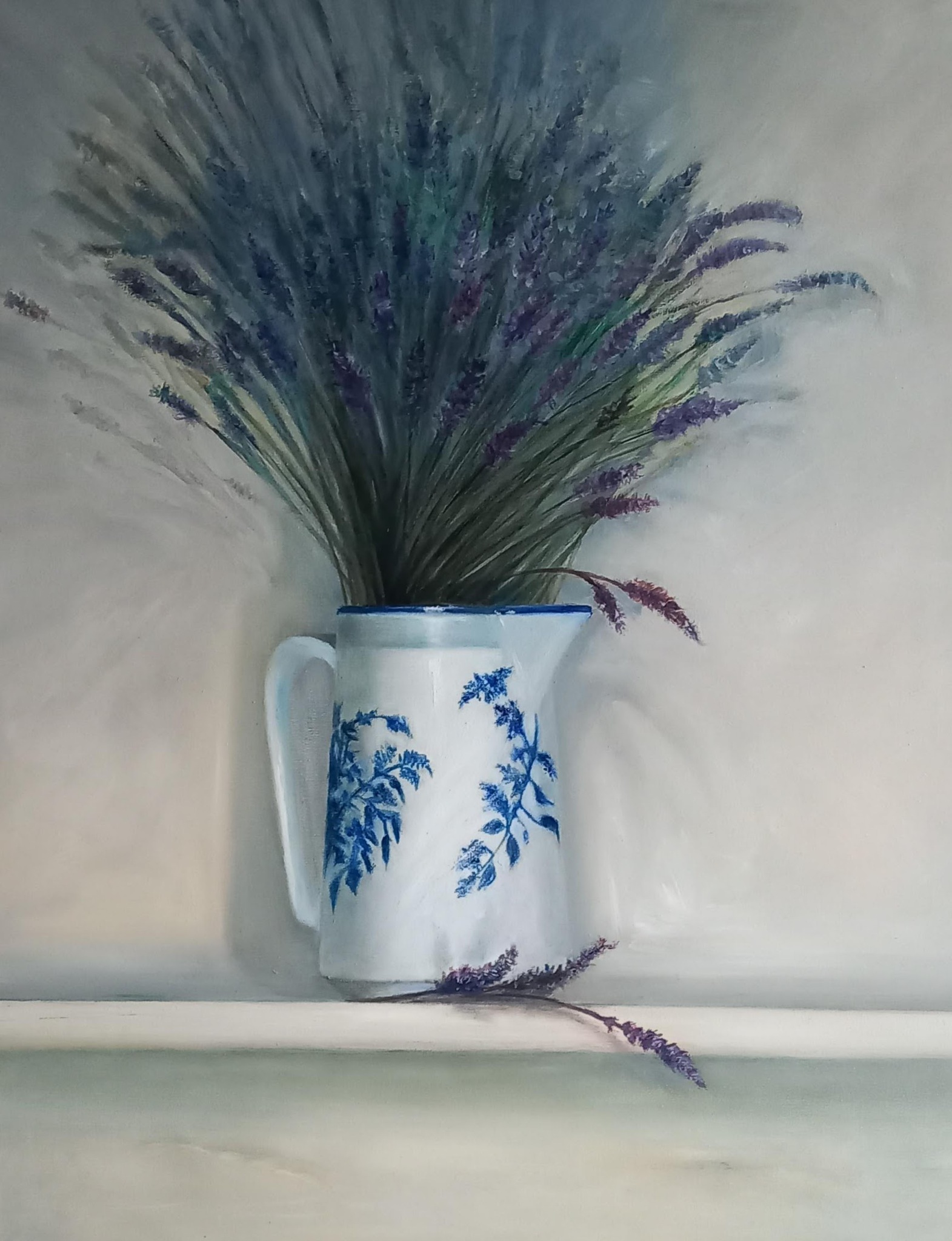 Wit Figuratief Blauw Paars Vaas Realistisch Olieverf Doek Stilleven Plant Kan Lavendel Schaduw