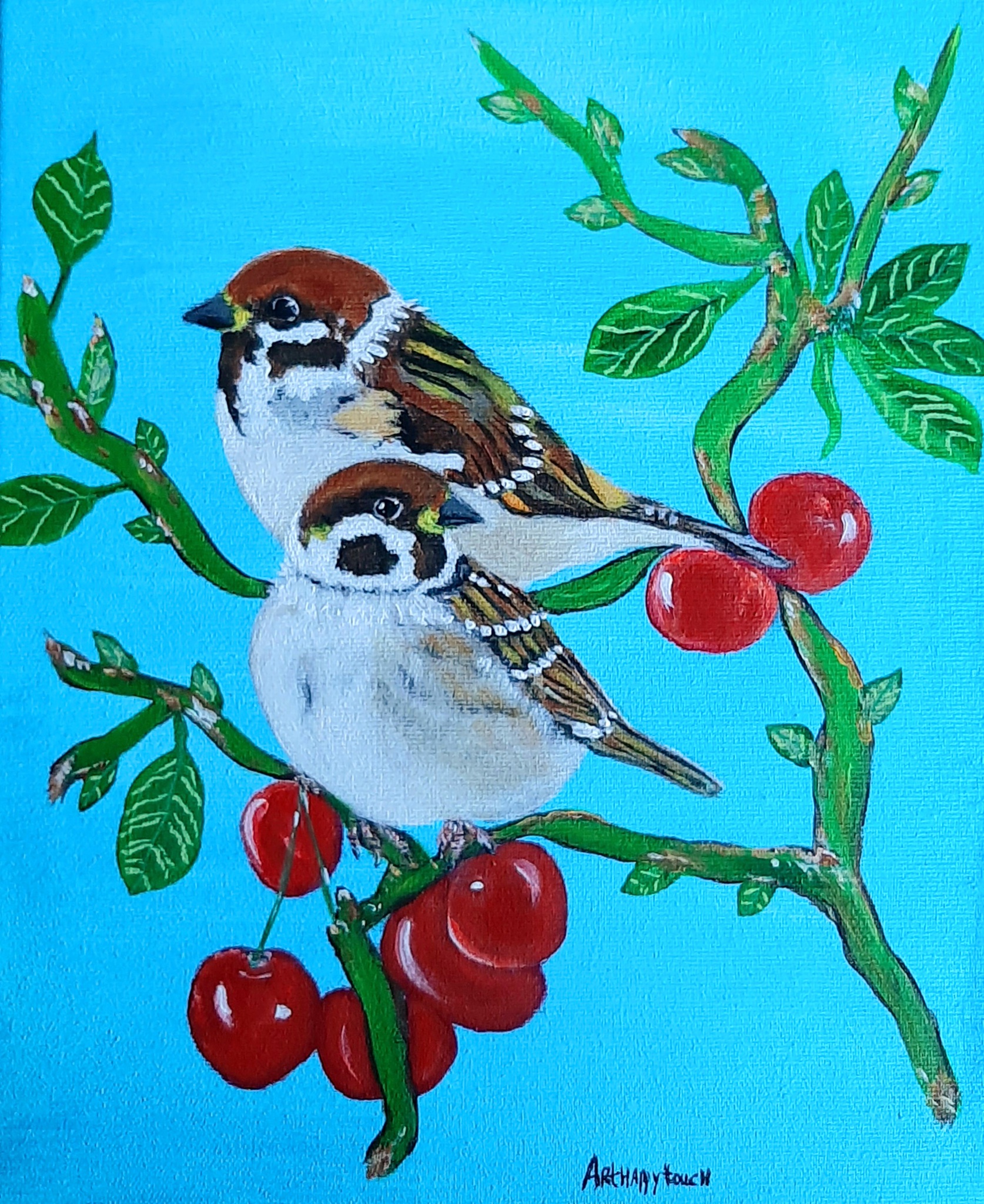 Mooi schilderij 2 mussen op een kersentak op een blauwe achtergrond in acryl