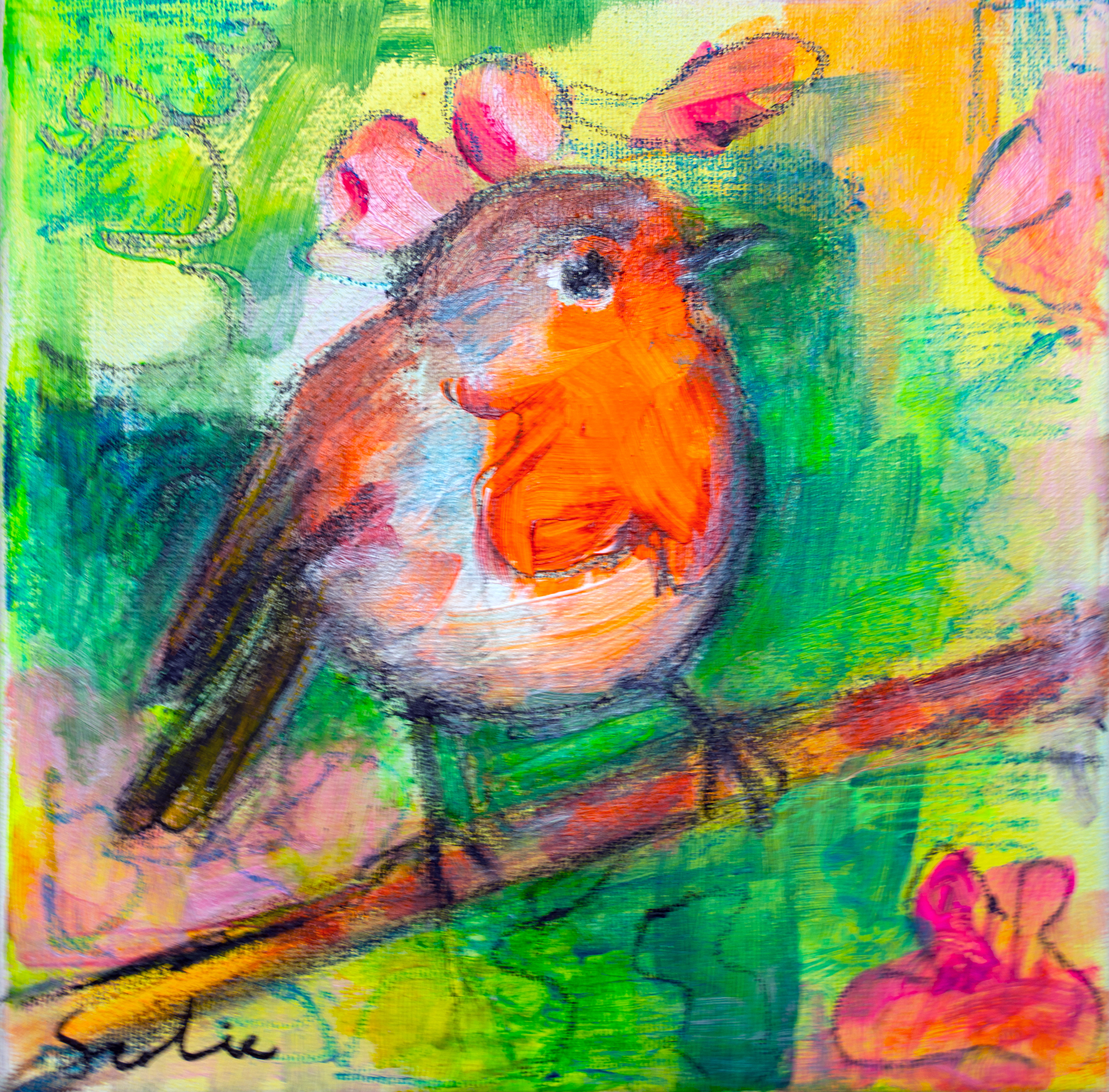 Schilderij Kleurrijk Tuin Kunst Natuur Vogels Roodborstje Artprint Buitenleven Tekoop