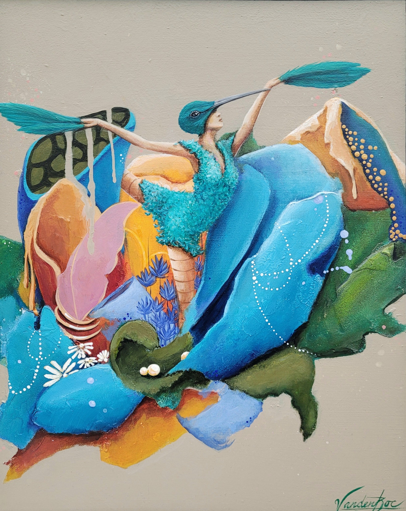 Afbeelding van een kolibrie vogelvrouw tussen kleurrijke abstracte bloemen. Verkrijgbaar bij SHE Art gallery in Nuenen. afm. 30 x 24 cm. Alle Little Treasures zijn geschilderd op paneel en zijn ingelijst in een handgeschilderde houten baklijst die qua kleur afgestemd is op het schilderij.