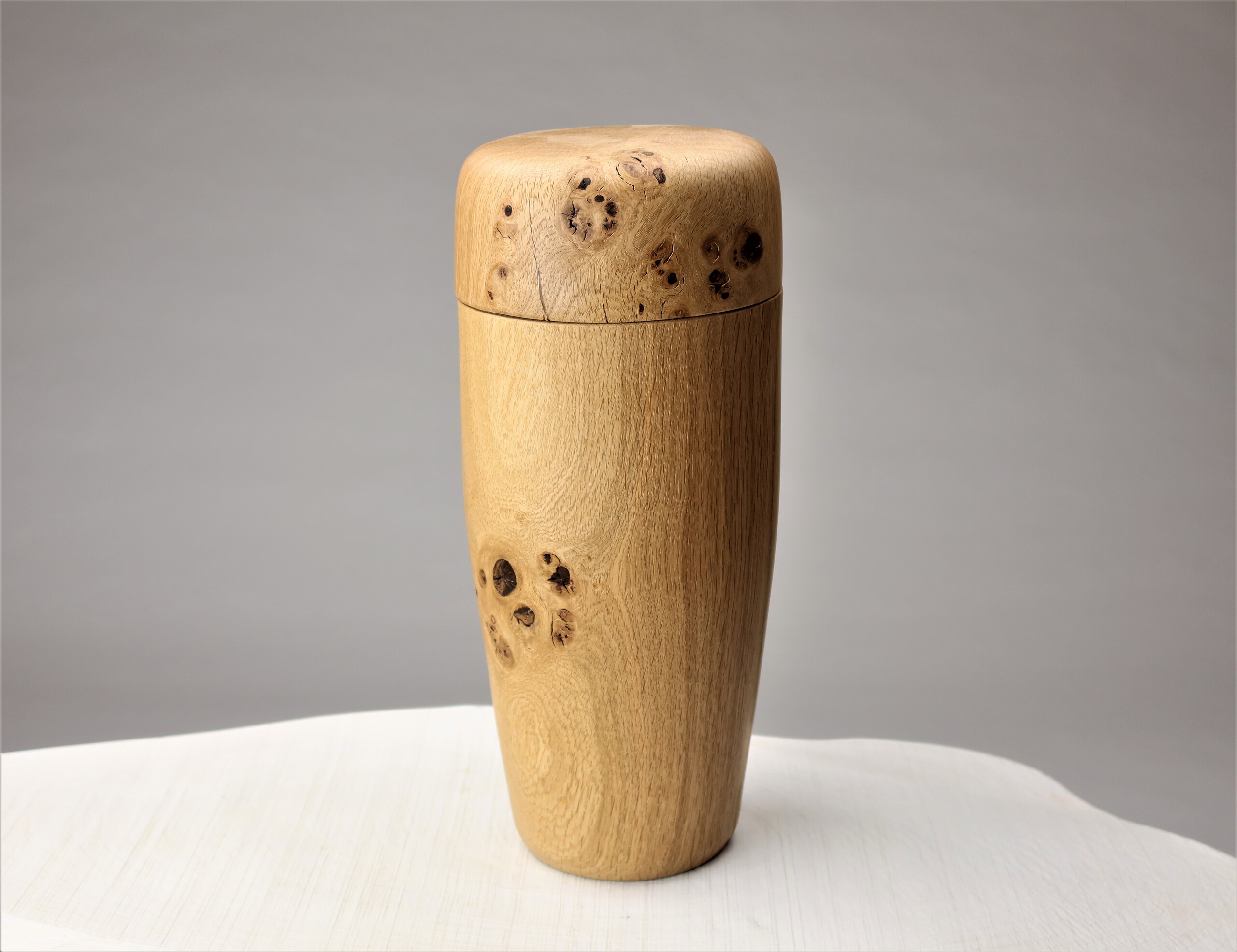 Urn uit het hout van monumentale eik op landgoed Stoutenburg. Hoogte 370mm. Diameter 160mm. Nr. 2022-02
