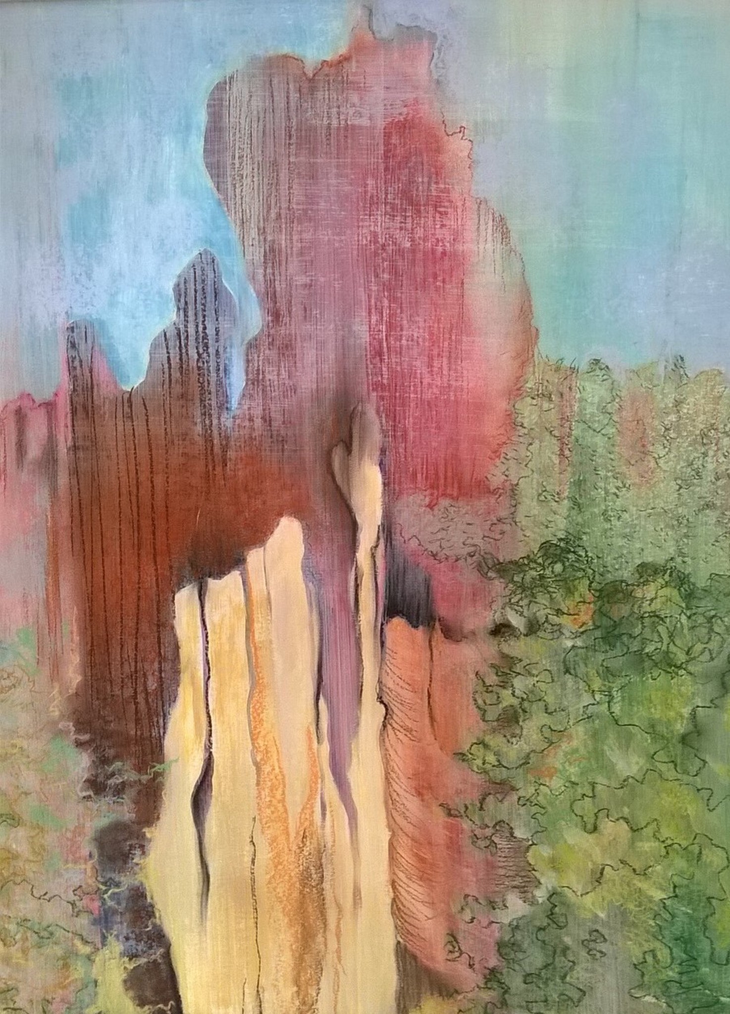 Acrylverf gecombineerd met krijt. Variatie op boomschorsschilderij.