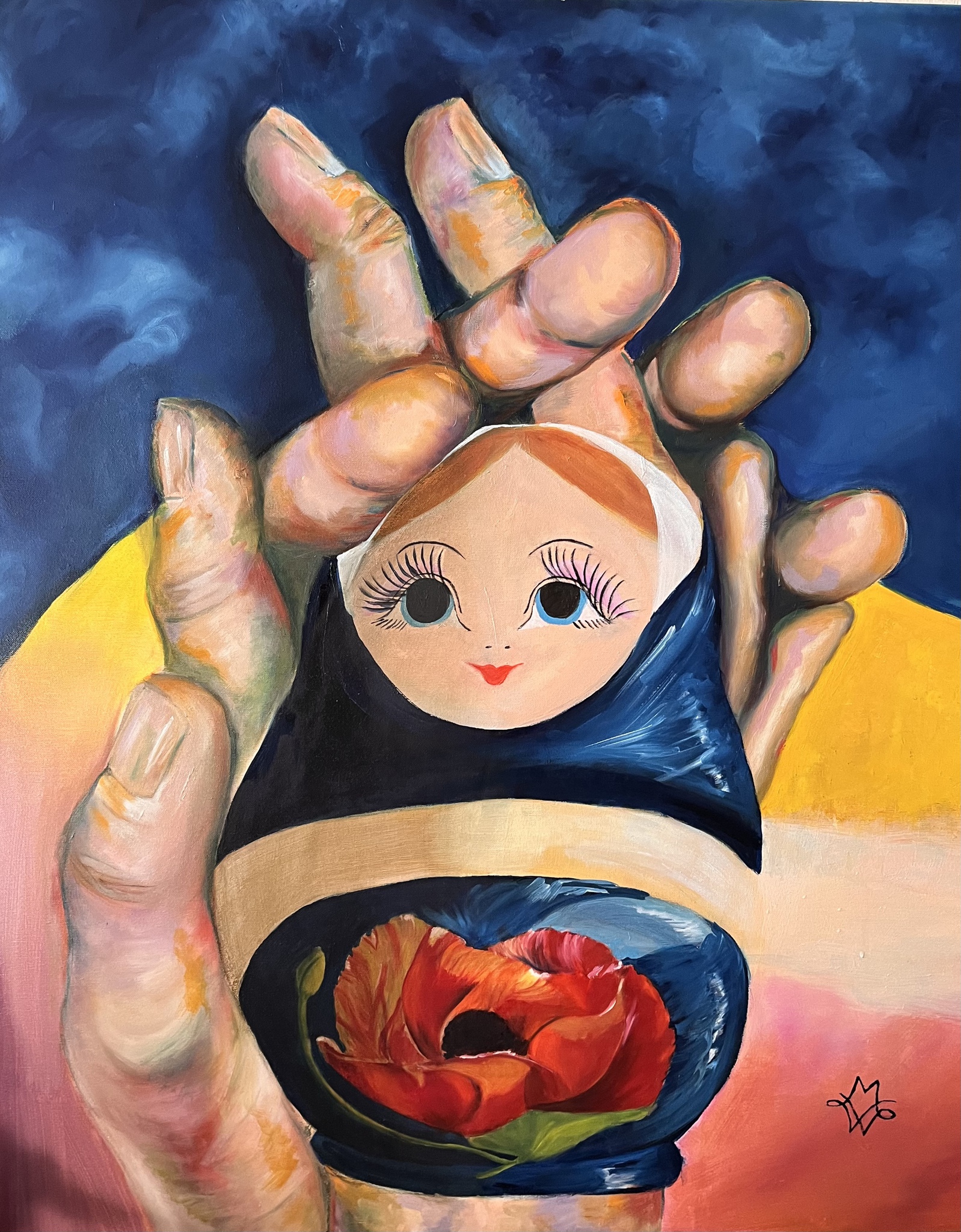 Dit schilderij toont de verbinding tussen twee volkeren met de Matroeska als centrale figuur. Het symbool voor de vruchtbaarheid. Op haar buik is een klaproos geschilderd dat ons aan de eerste wereldoorlog doet herinneren. Klaprozen zijn immers overal ik heb me laten vertellen dat een zaadje een eeuw kan overleven. Hopelijk krijgt de communicatie tussen de beide landen weer een positieve wending