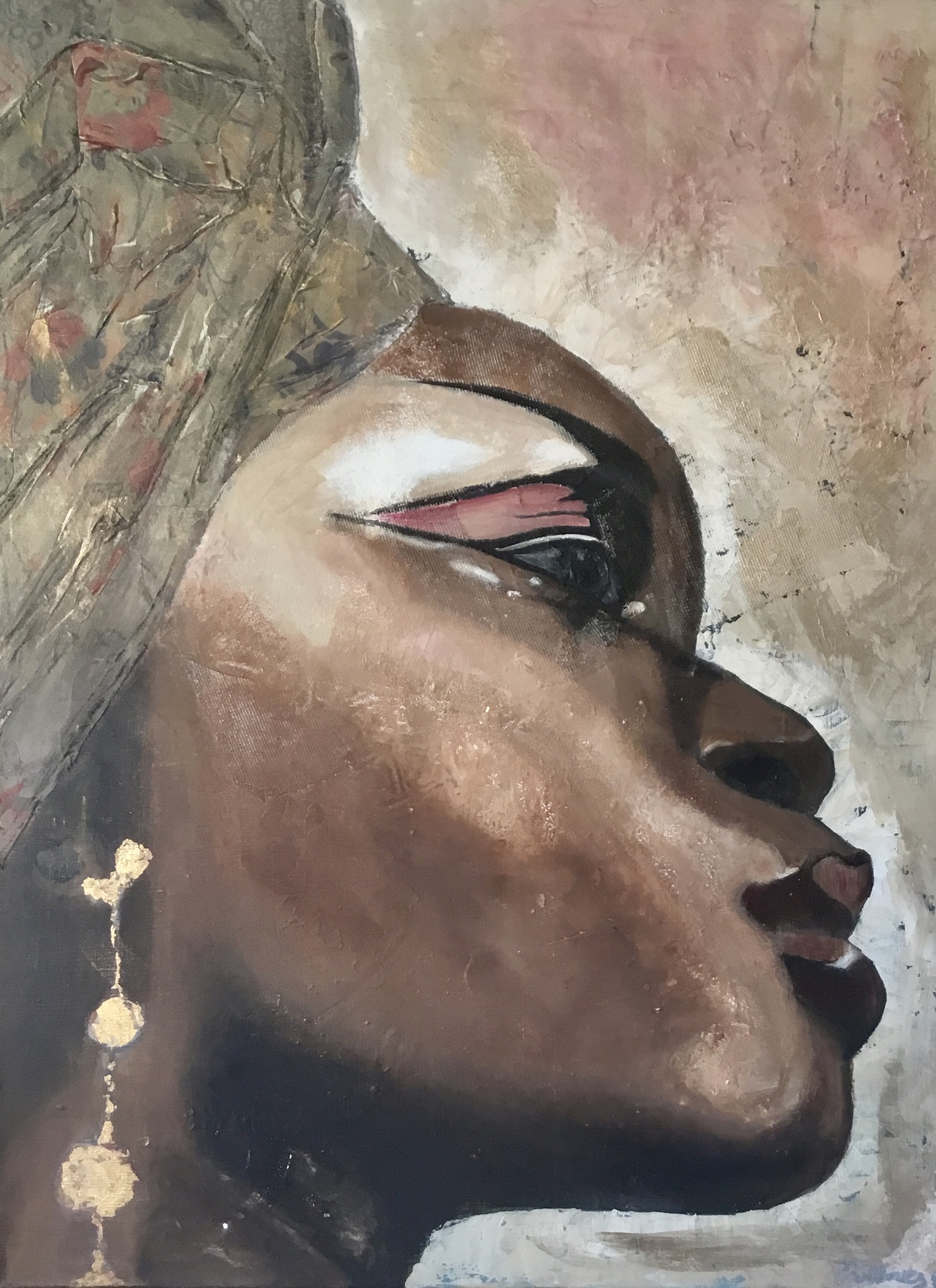 Portret in acryl, met krijtpoeder, stof en bladgoud. Incl. Blanke baklijst.