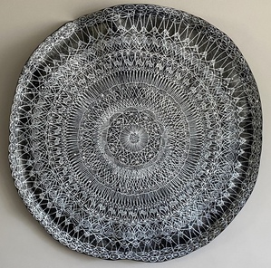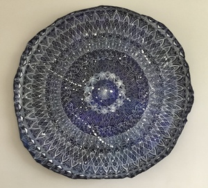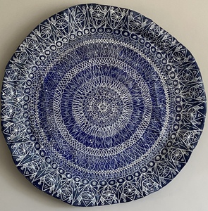 Een wandbord vervaardigd van papierklei in blauwtint na droging beschilderd in kantpatroon.