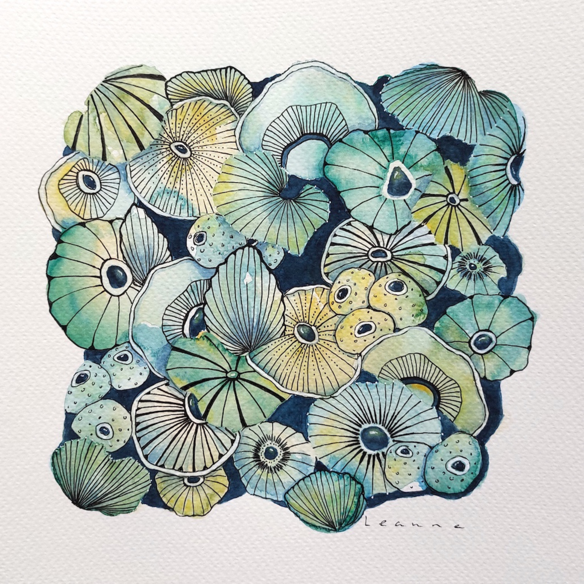 En Route. Onderweg ben ik een nieuwe weg ingeslagen. Aquarel met pentekening. Geïnspireerd op koraal, zeeleven, zentangle en doodles. Kleinere werken op papier, met grootse impact.