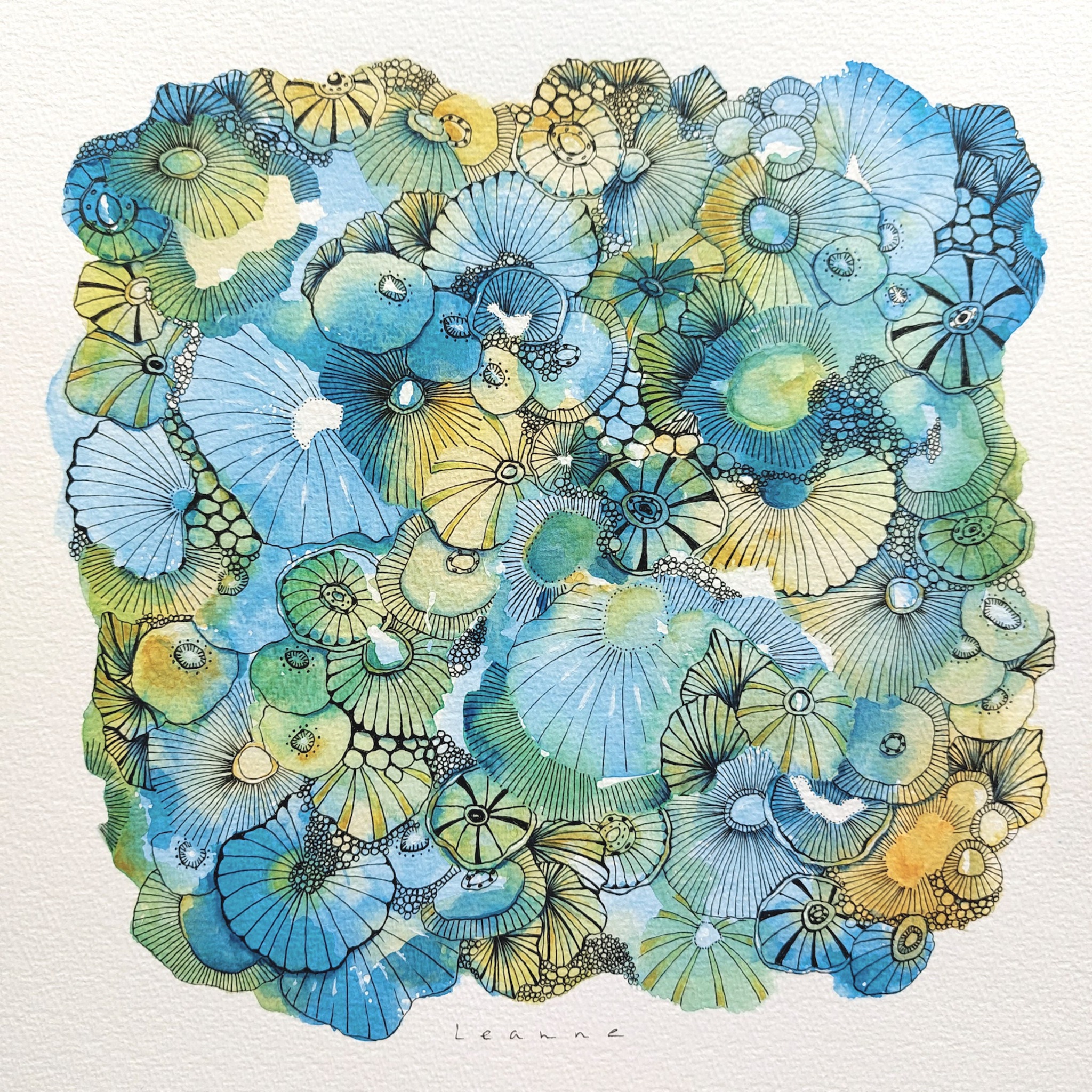 En Route. Onderweg ben ik een nieuwe weg ingeslagen. Aquarel met pentekening. Geïnspireerd op koraal, zeeleven, zentangle en doodles. Kleinere werken op papier, met grootse impact.