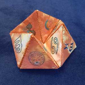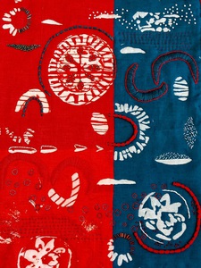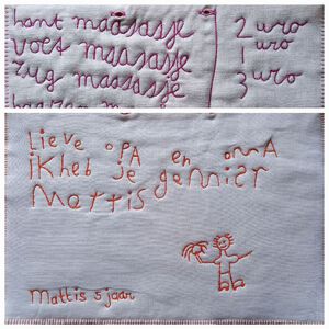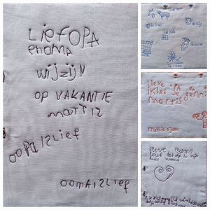 Over een kant en klare quilt, dus 3 lagen stof, een vierde laag gelegd. Het geheel is vrij doorgestikt. Daardoor ontstonden er allemaal vlakjes. Door diverse vlakken open te knippen ontstaat dit beeld. Je ziet toch de oorspronkelijke quilt er doorheen.
