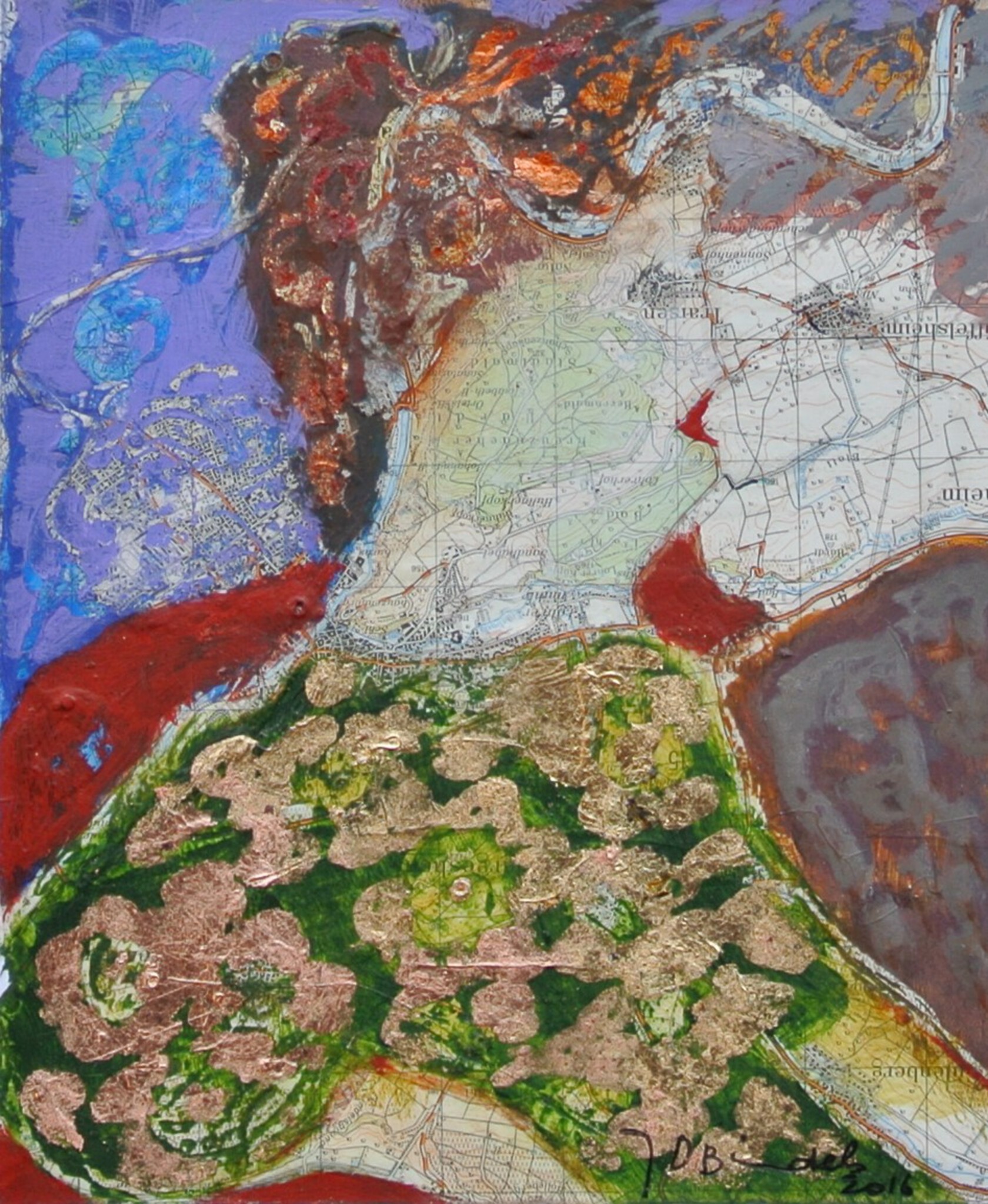 Gemengde techniek op landkaart ( met bladgoud )