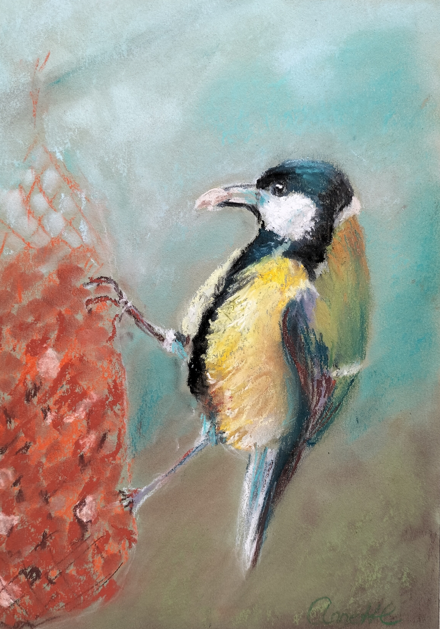De koolmezen in mijn tuin doen zich tegoed aan de pinda's. Pastelkrijt op papier.