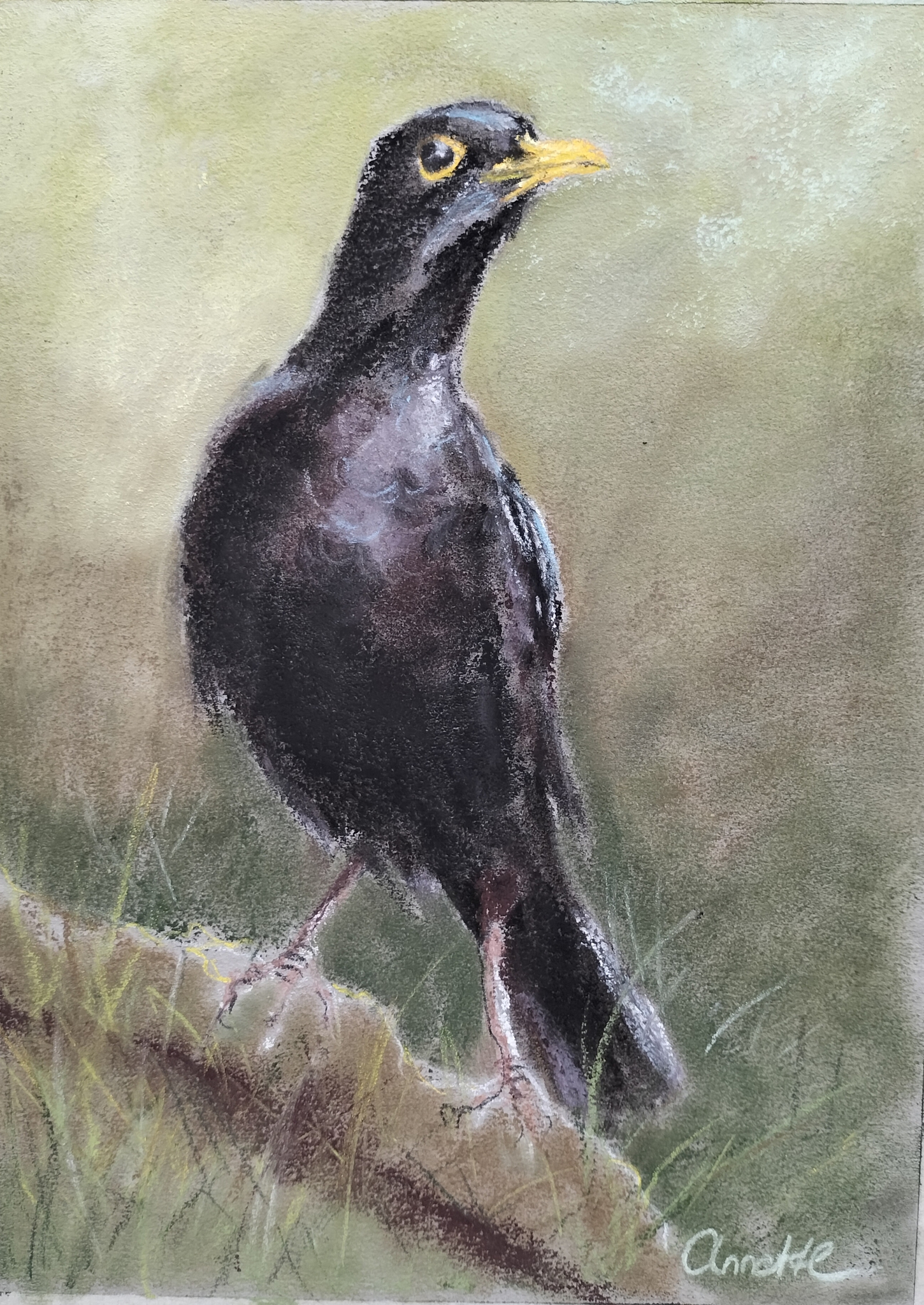 Merels kunnen heel erg nieuwsgierig zijn en eigenwijs rondneuzen in de tuin. Pastelkrijt op papier.