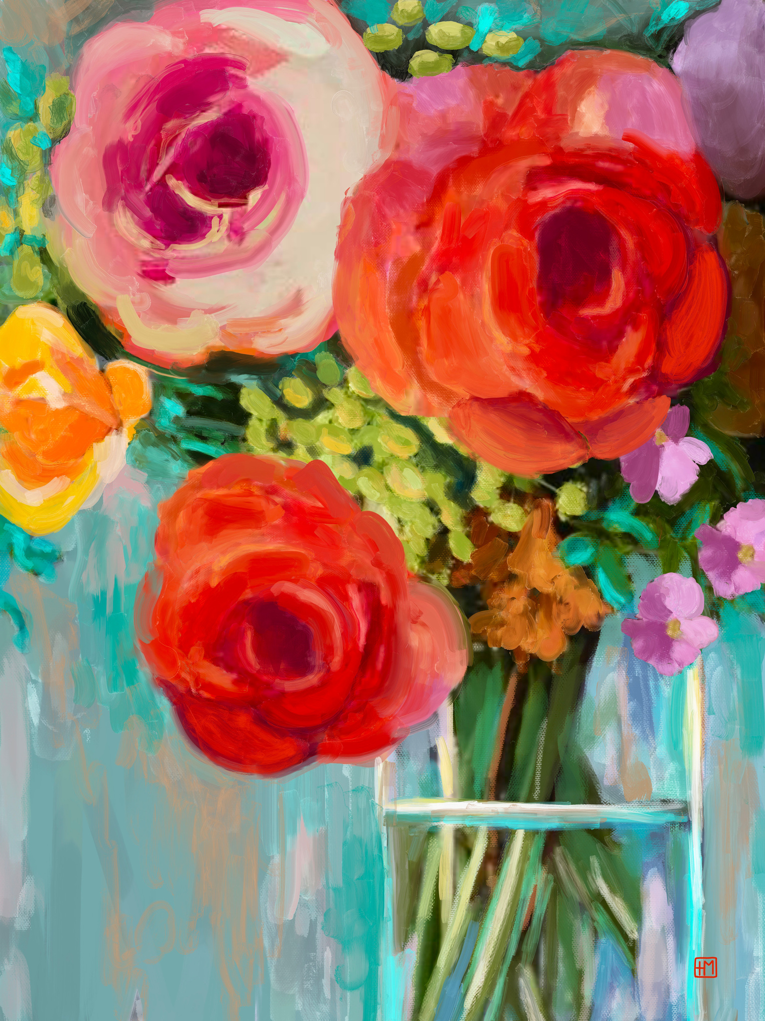 Dit schilderij is nog te koop als art-print. Bloemen uit Nederland, we staan er om bekend. Heerlijke mooie bloemen in vrolijke voorjaarstinten. Geïnspireerd door de bloemenmarkt in Amsterdam in het voorjaar. Een prachtig schilderij met bloemen in vrolijke kleuren. Enigszins geabstraheerd geschilderd. Abstracte bloemen poster. Kleurrijk en vrolijk schilderij om elke dag vrolijk van te worden. Voorjaarsbloemen in een vaas. Bloemen uit Nederland.