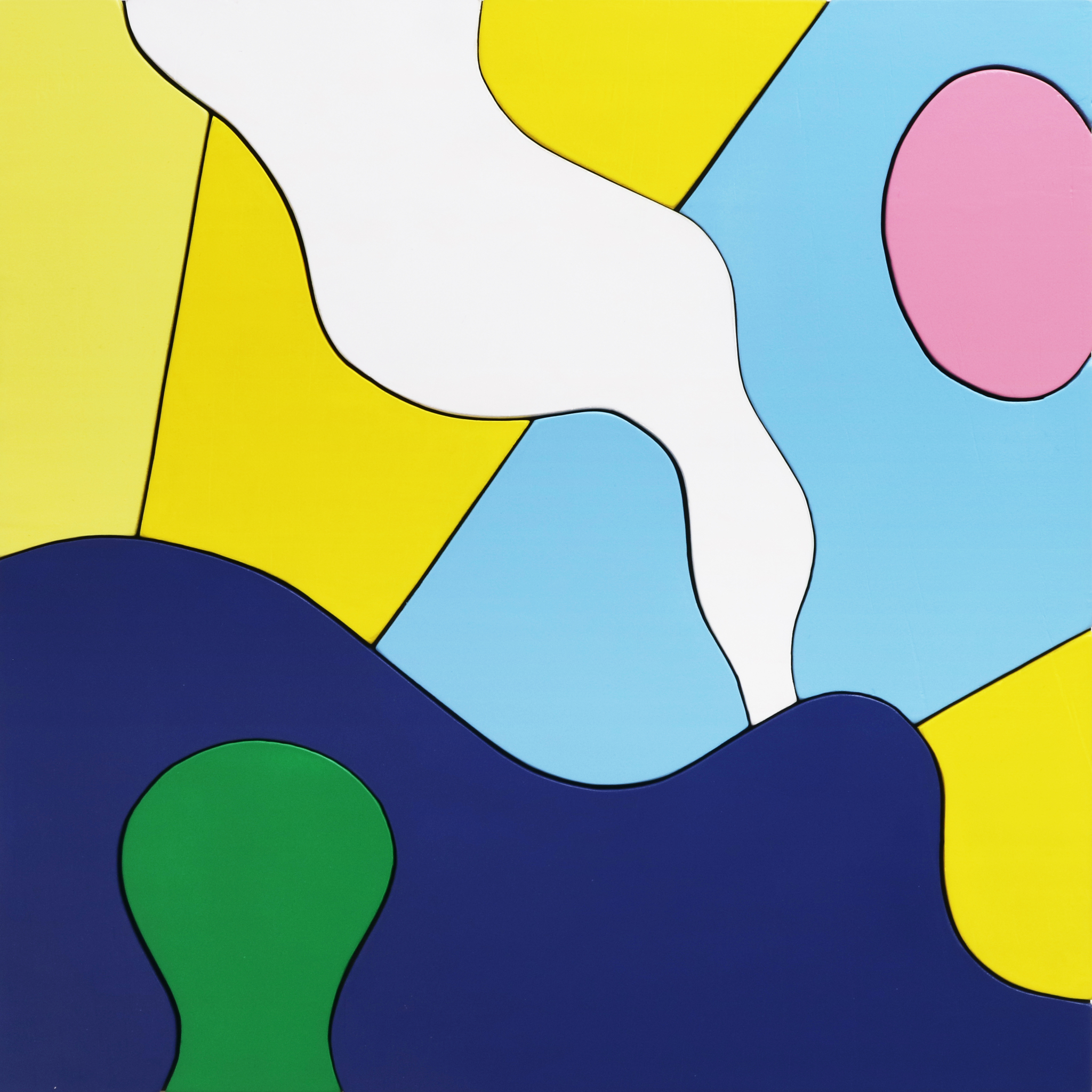 Schilderij opgebouwd uit gekleurde vormen gezaagd uit multiplex, gemonteerd op een drager van multiplex (zwart). Voorzien van hangsysteem aan de achterzijde.